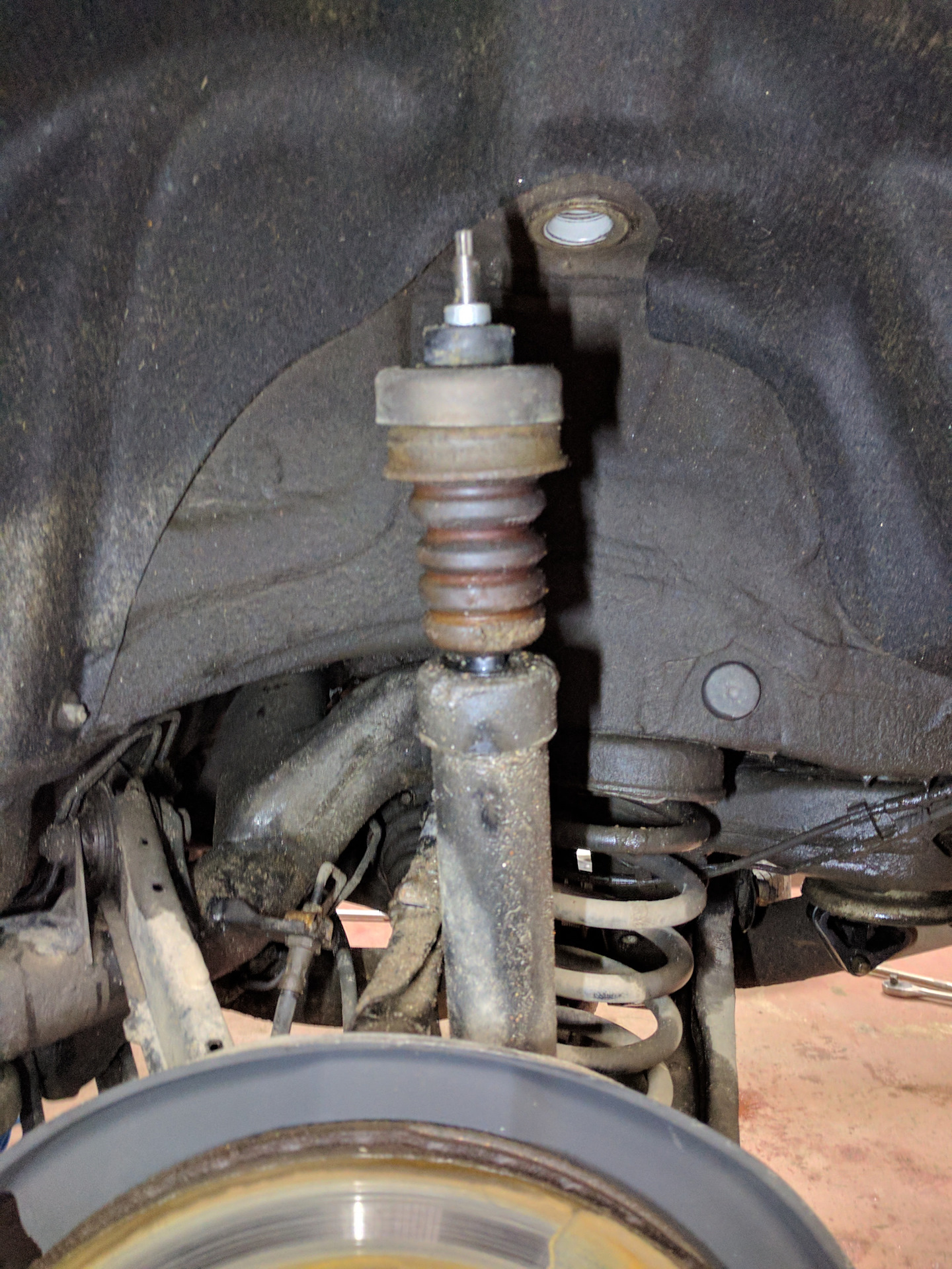 Всем привет. Машина мне досталась с вытекшими передними амортизаторами(были заменены сразу) и с отсутствующим пыльником на заднем левом. Как и куда он делся, не имею ни малейшего представления, может его срезали какие- нибудь "умники" после того, как он свалился с отбойника и начал там грохотать… Первая мысль о покупке и установке нового пыльника была отметена в силу большой вероятности кончины самих амортизаторов по примеру передних и нежелания лезть туда ещё раз. Мне казалось, что по закону подлости, я сегодня поставлю туда пыльник, а завтра потечёт аморт. Короче я забил на него. Одевая зимние колёса заметил долгожданные следы масла, только это оказался правый))), а по ресурсу я ошибся на 15 тысяч км.