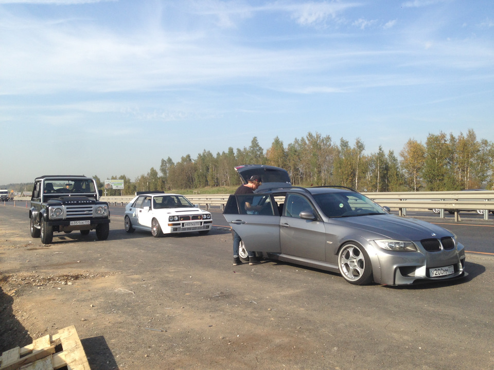 Ездили вот таким составом. БМВ для перевозки оборудования и укладки асфальта. Дефендер для сьемок ходом. Причем нужен был не простой деф, а лимитированный, с обычными дельта дела иметь не хотела. Нашли. Согласилась.