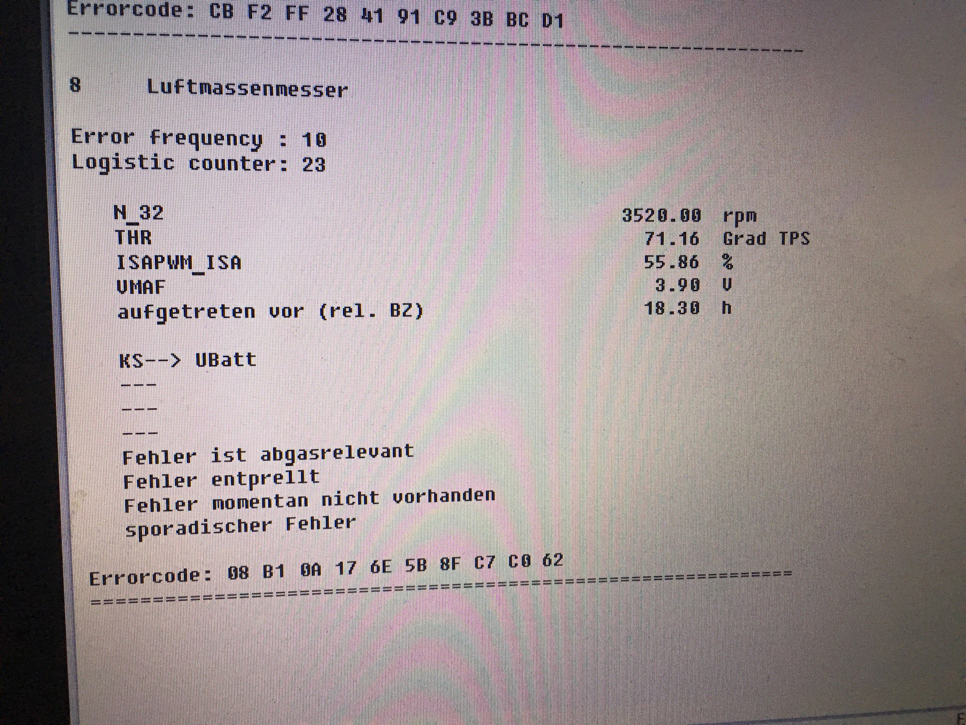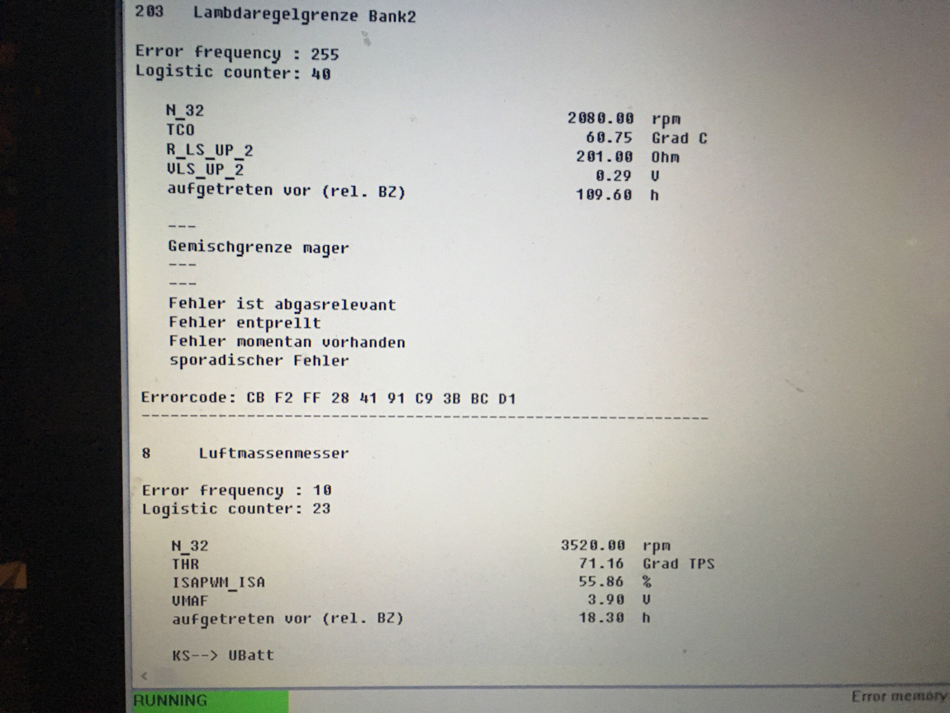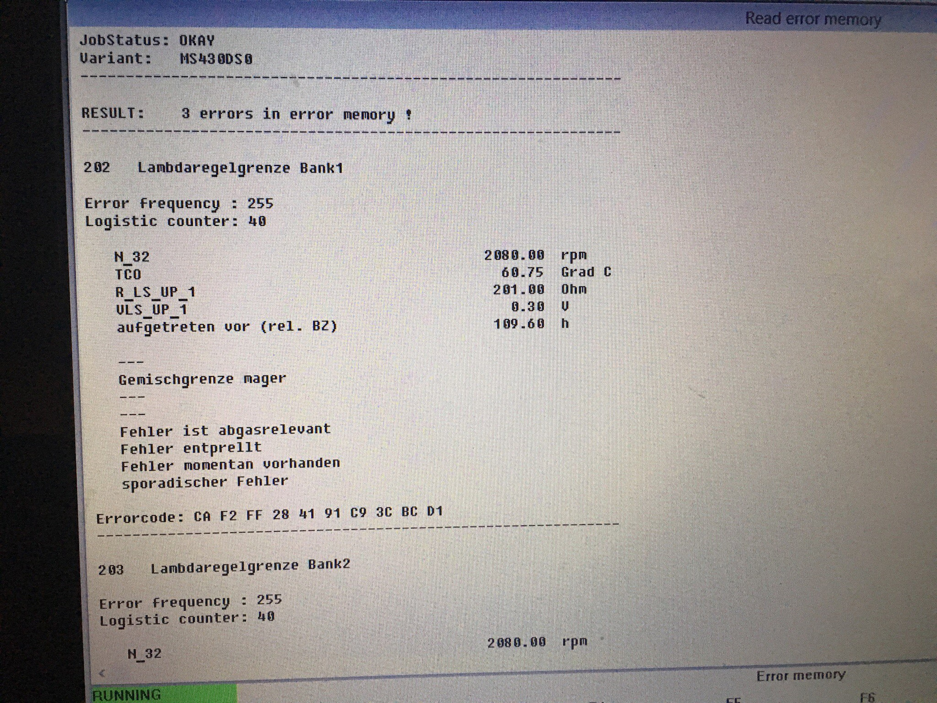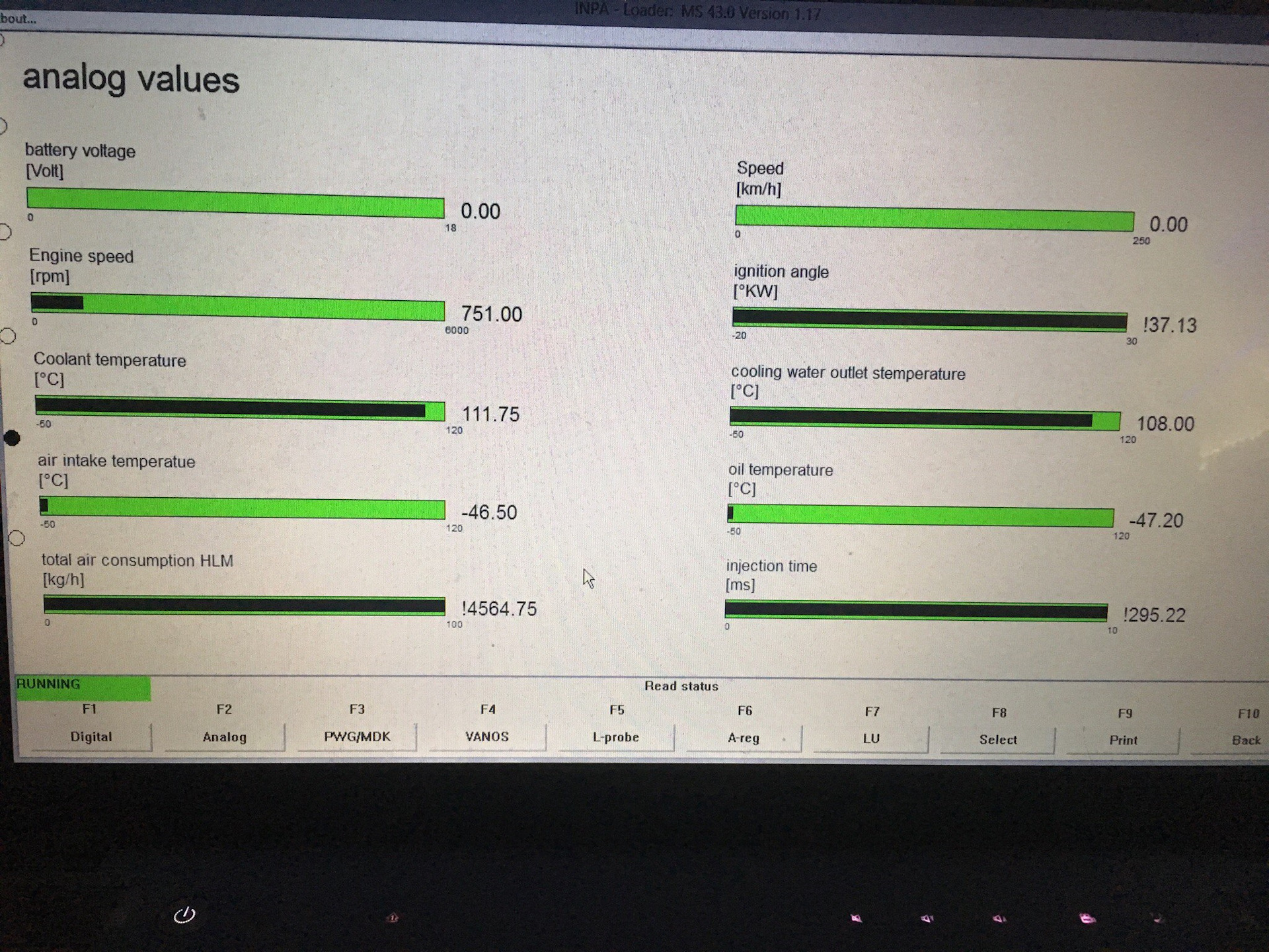 А в чем уверенность нужна то? Инрой написано, что ДМЕ 43-й, по данным аналоговых показателей тоже кажет, что должно быть два ряда лямбд, до катализаторов и после. Но только этих лямбд то, судя по показателям нету и в помине. Датчик температуры входящего воздуха тоже по ходу каюк, если только на улице не -46,5 и странно почему напряжение аккумулятора 0 Вольт.