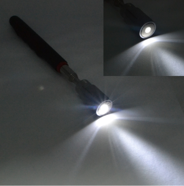 Прикольная штука, На конце имеется магнит, очень удобно доставать мелкие предметы такие как болты, ключи . Фонарь светит не сильно ярко но в темноте все видно .