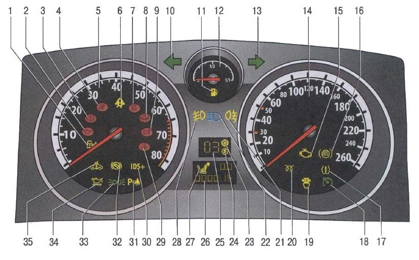 13 — контрольная лампа включения правого указателя поворота (в виде стрелки со светофильтром зеленого цвета) загорается мигающим светом при включении правого указателя поворота (синхронно с ним). Мигание контрольной лампы с удвоенной частотой свидетельствует о перегорании лампы в каком-либо указателе правого поворота или о перегорании предохранителя в его цепи.