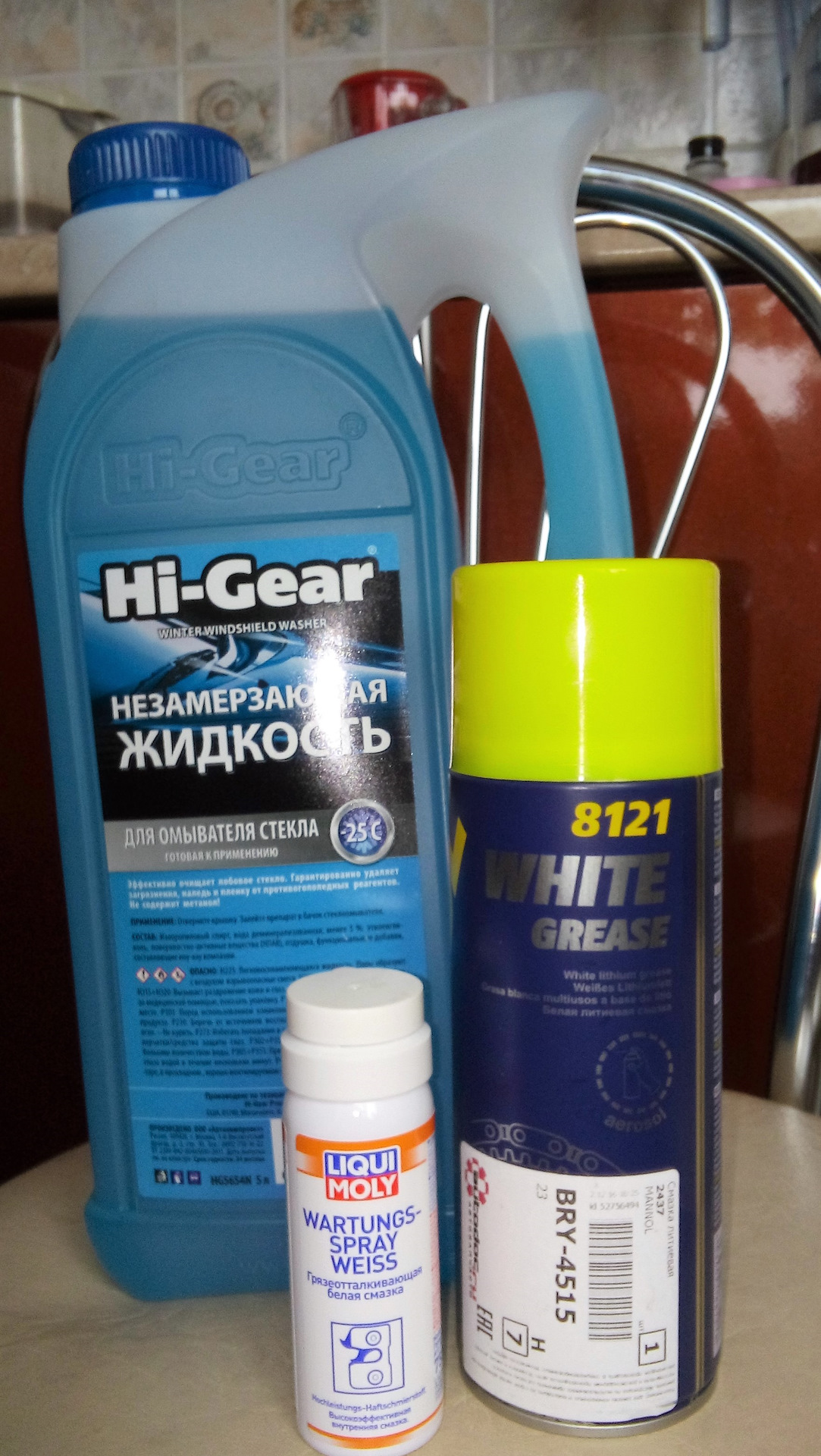 Для того чтобы легче переносилась зима, дополнительно взял омыватель стекол Hi Gear (HG5654N) — в прошлом году понравился. Этот вариант отличается большей горловиной, на прошлой было горлышко для заливки, может и тут спрятано.