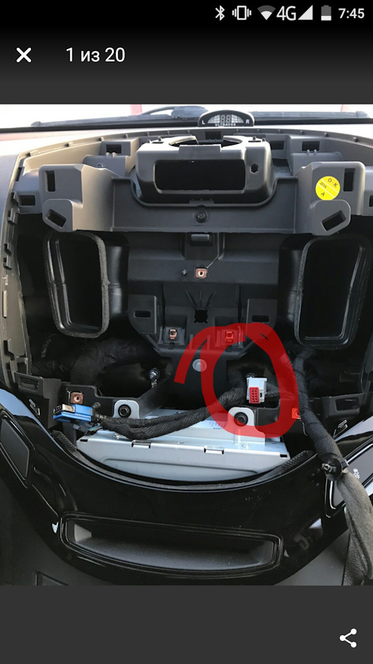 Начинаем с козырька, который с экранчиком. Открываем бардачок на консоли, подковыриваем и ухватываемся за воздуховоды, тянем на себя — держится эта панель на металлических клипсах плюс пара пластиковых уголков, которые выщёлкиваются из-под козырька. Закрываем бардачок, отвинчиваем пару болтов слева и справа, которые его держат. Дёргаем на себя (опять пара металлических клипс) и бардачок остается в руках, отключаем проводку из разъёма справа, а также проводку AUX и USB. Откручиваем один единственный болт, который держит козырек, хватаемся в том месте, где он вкручивается, и тянем на себя-вверх, чтобы выщелкнуть клипсы. Отключаем разъём от экранчика, но никуда не прячем, он будет подключаться к новому ГУ, чтобы работали кнопки бардачка и его подсветка, а также авторегулировка яркости подсветки нового экрана — это важный момент, нигде не упомянутый. Изначально я этот разъем просто хотел спрятать, потому как новый экранчик подключается иначе. В итоге, после всех манипуляций получилось вот так: