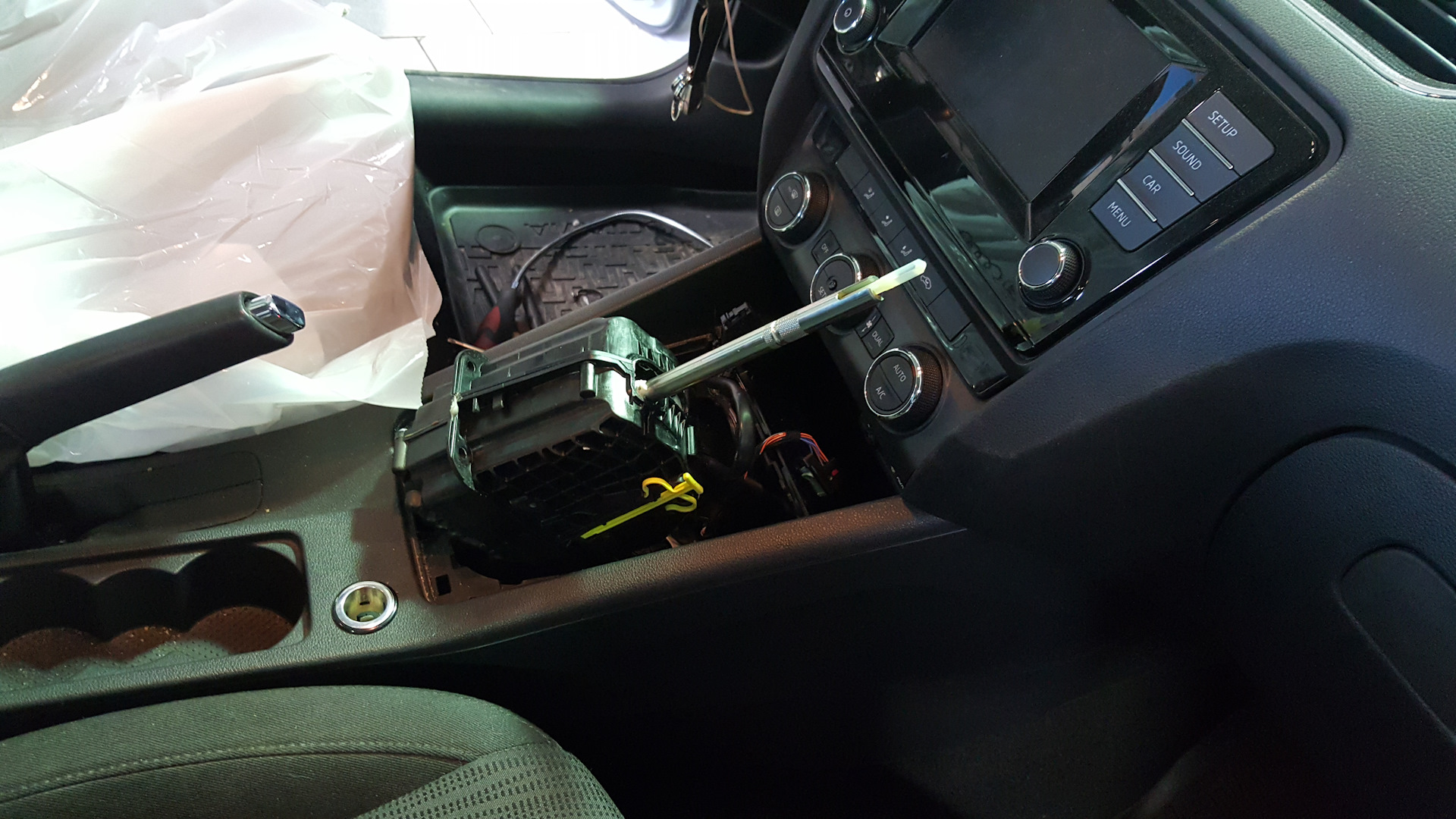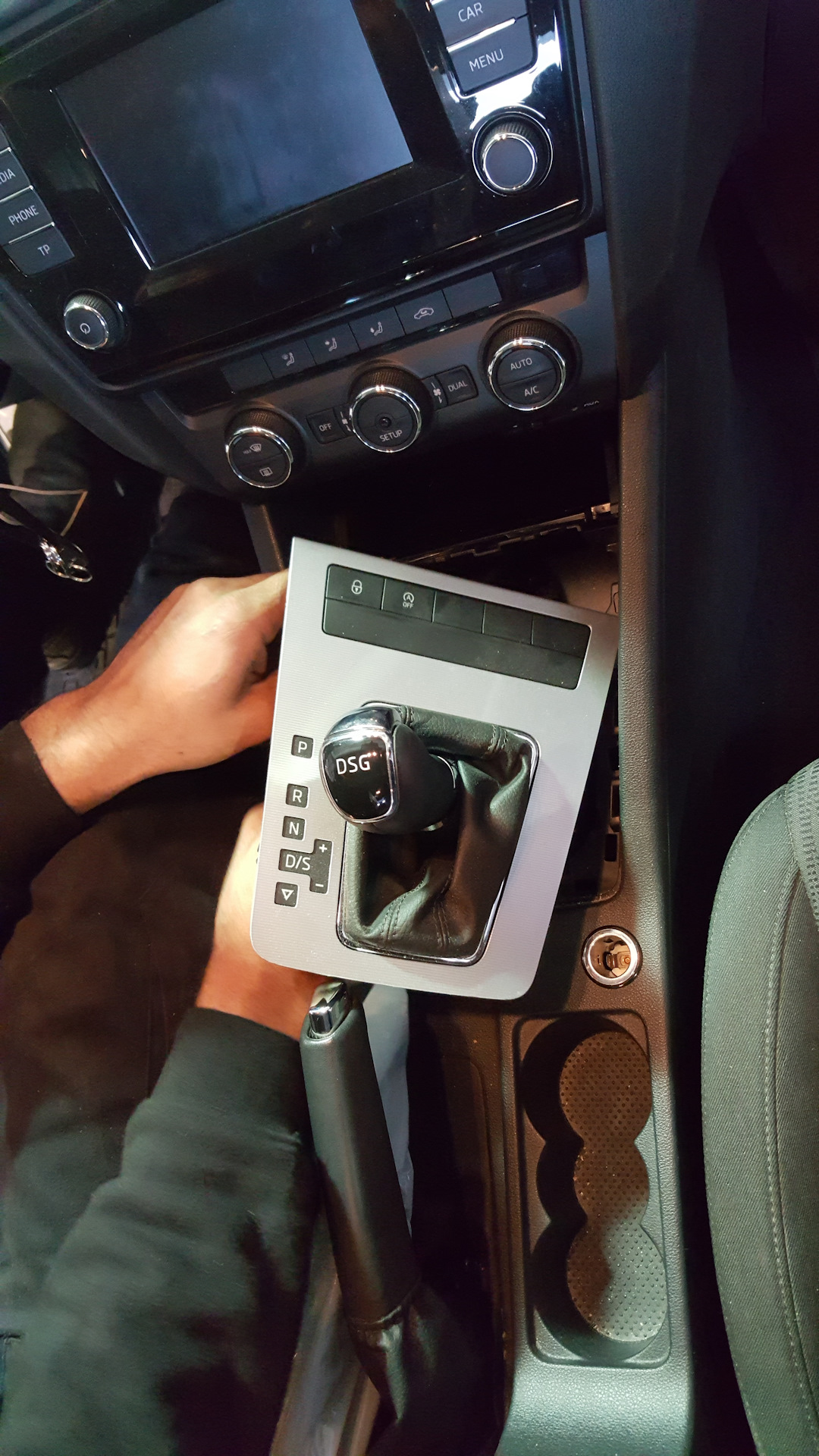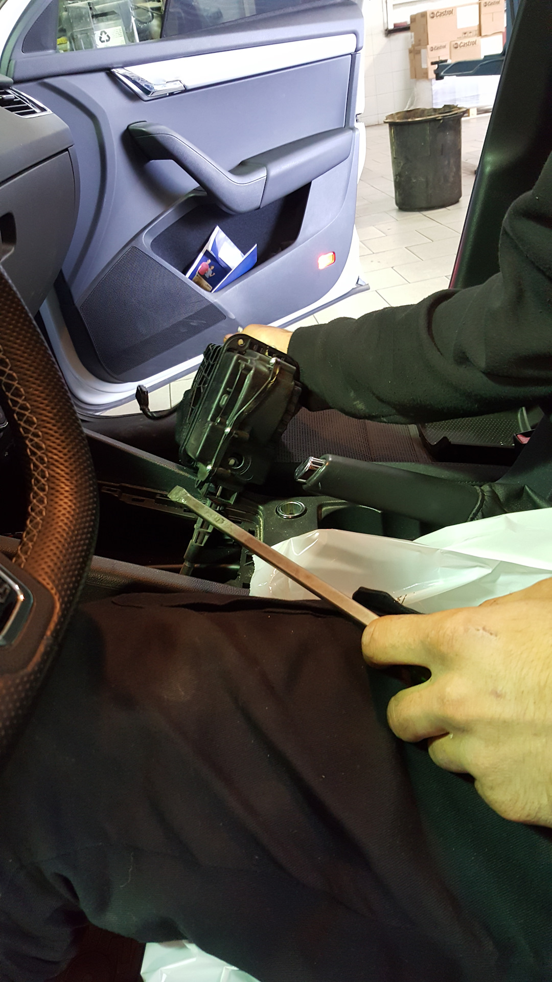 Подключили комп сняли логи, перегнал машину в рабочую зону, вышел механик говорит на лифт не нужно работа минут на 20 …, как так мне мол сказали на 4 часа оказалось девушка приемщица перепутала с Rapid там нужно снимать весь Джамбо бокс, а на Octavia рукоятка выходит через отверстие декоративной панели .