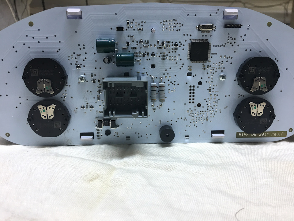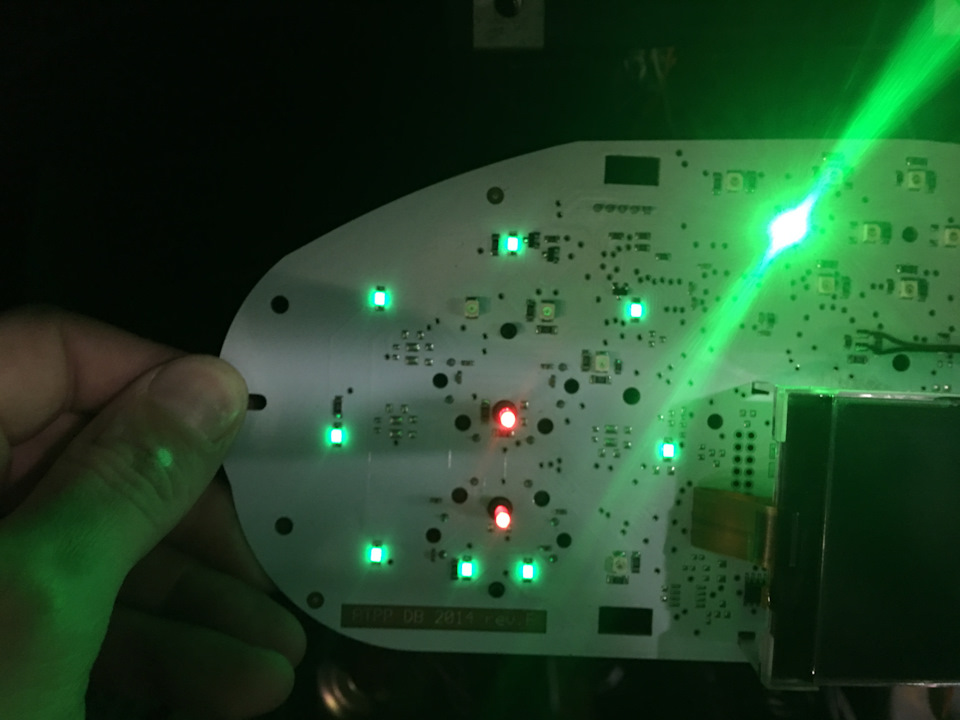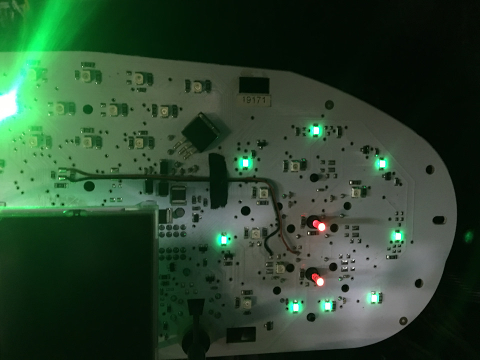 Было принято коллегиальное решение заняться реверс-инжинирингом панели. В процессе изучения алгоритма ее работы, было выяснено, что включением/отключением индикации работы круиз-контроля управляет контроллер приборной панели. Который, в свою очередь, по CAN работает с ECU. Поэтому простая подача управляющего импульса на колодку приборной панели и далее на контроллер приборной панели ничего не даст. О мелочи, в виде отсутствия smd-светодиодов в количестве двух штук на монтажных местах я говорить не буду, поскольку это элементарно решается с помощью паяльника. Почему их два? Потому что индикация, вполне возможно, идет двух режимов: активного и пассивного, с, соответственно, подсветкой зеленого и желтого цвета.