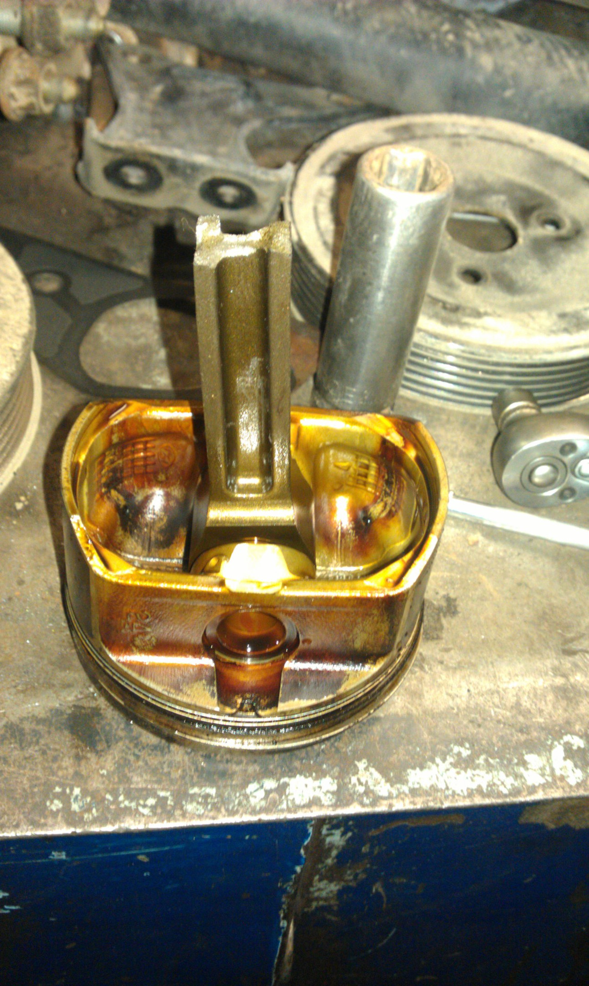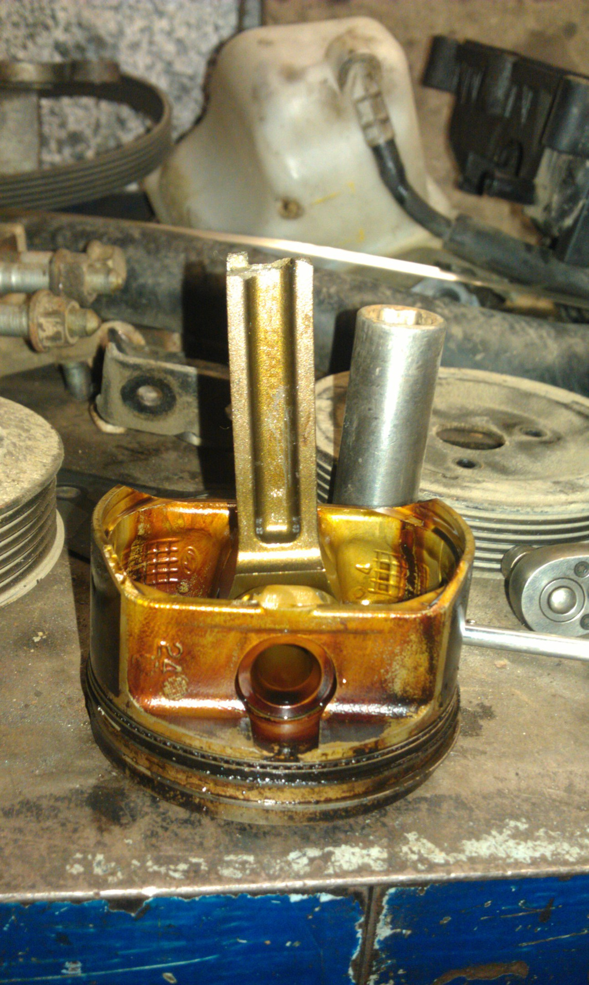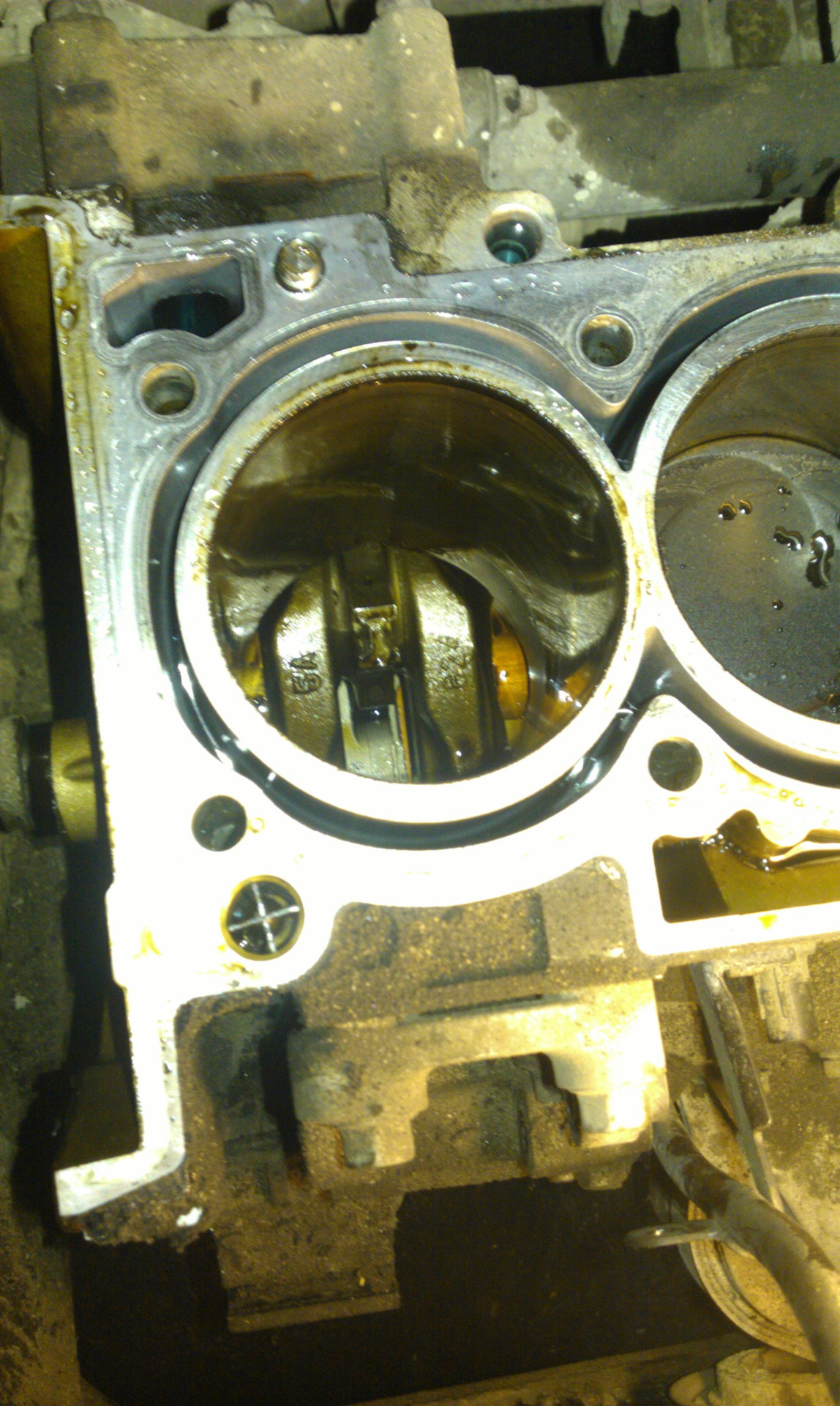 Сняли крышки, стали выставлять метки, чтоб проверить не перескочила ли цепь(просто машина дома завелась, но с таким металлическим лязгом, сразу заглушили, подумали цепь)проверяем чтобы шатун тоже был в верхней точке, в положение ВМТ. И вот тут то…один шатун как был в верхнем положении, так в нем и оставался, вращение коленвала никак на него не влияло. Дальше уж, мы бы точно сами не справились.