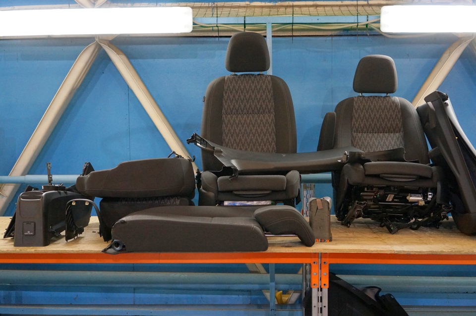 Сиденья и прочие панели на отдельном столе за машиной.