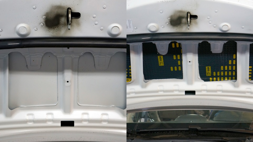 Так как работают несколько человек, то делается многое одновременно. После крыши был капот. Помимо материала на металл, к накладке капота был приклеен войлочный материал, только после этого панель была установлена обратно. В итоге два слоя и накладка.
