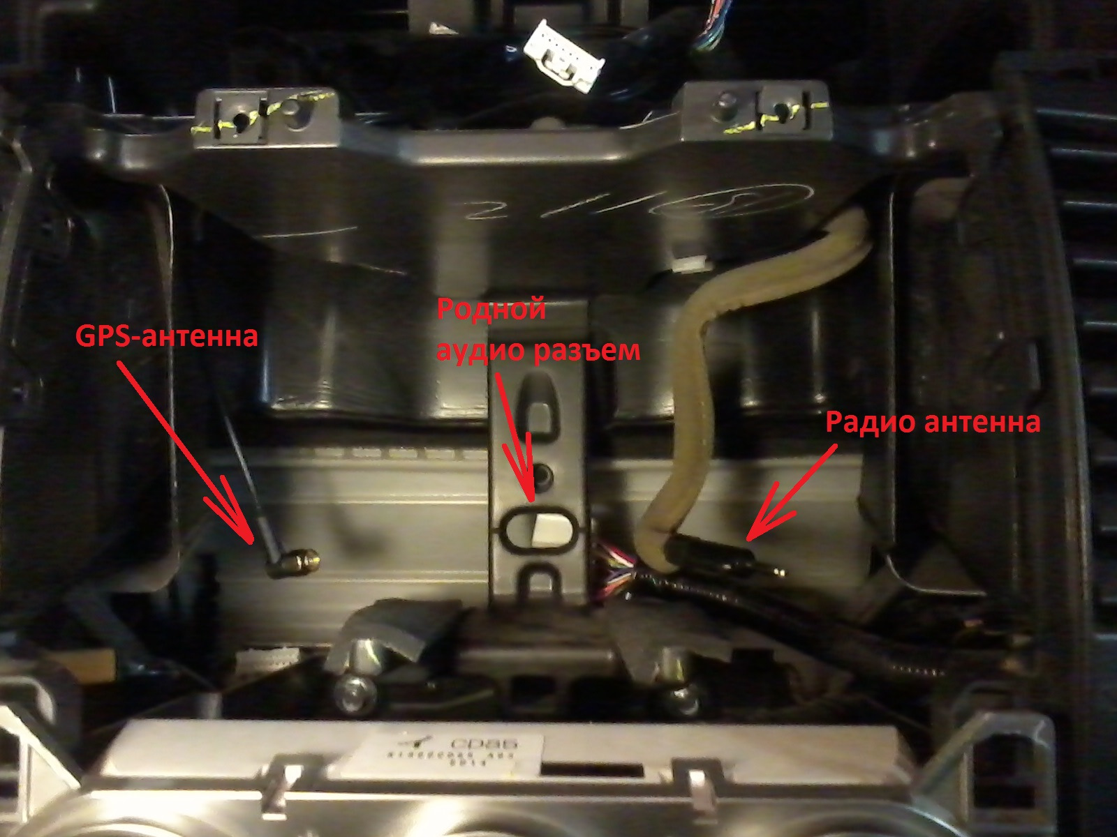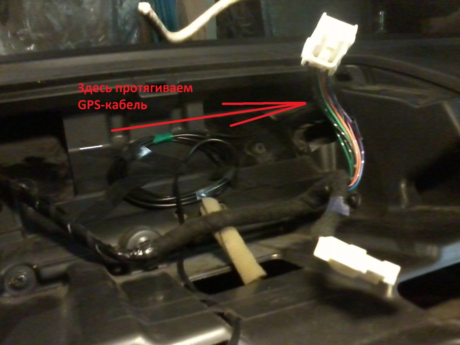 Радиоантенный кабель выводим с правой стороны, GPS-кабель с левой, аудиоразъем прячем по центру за пластиковой стойкой:
