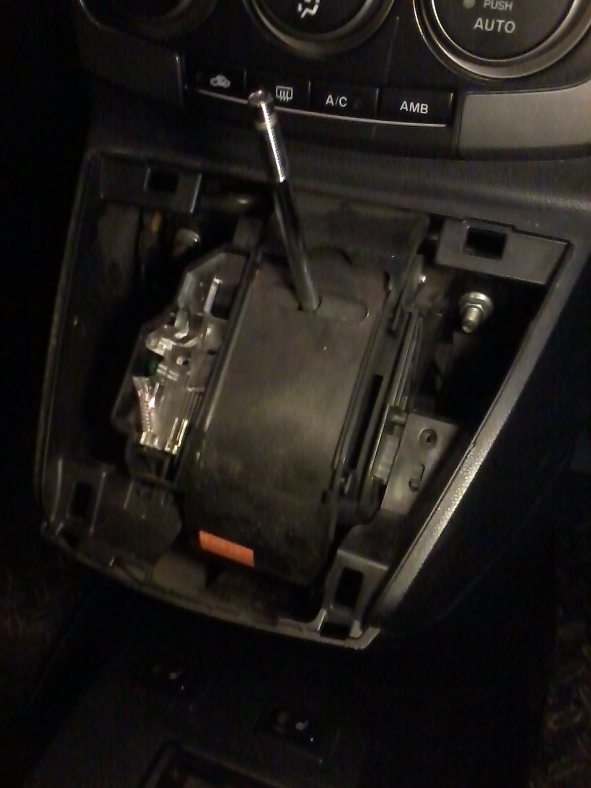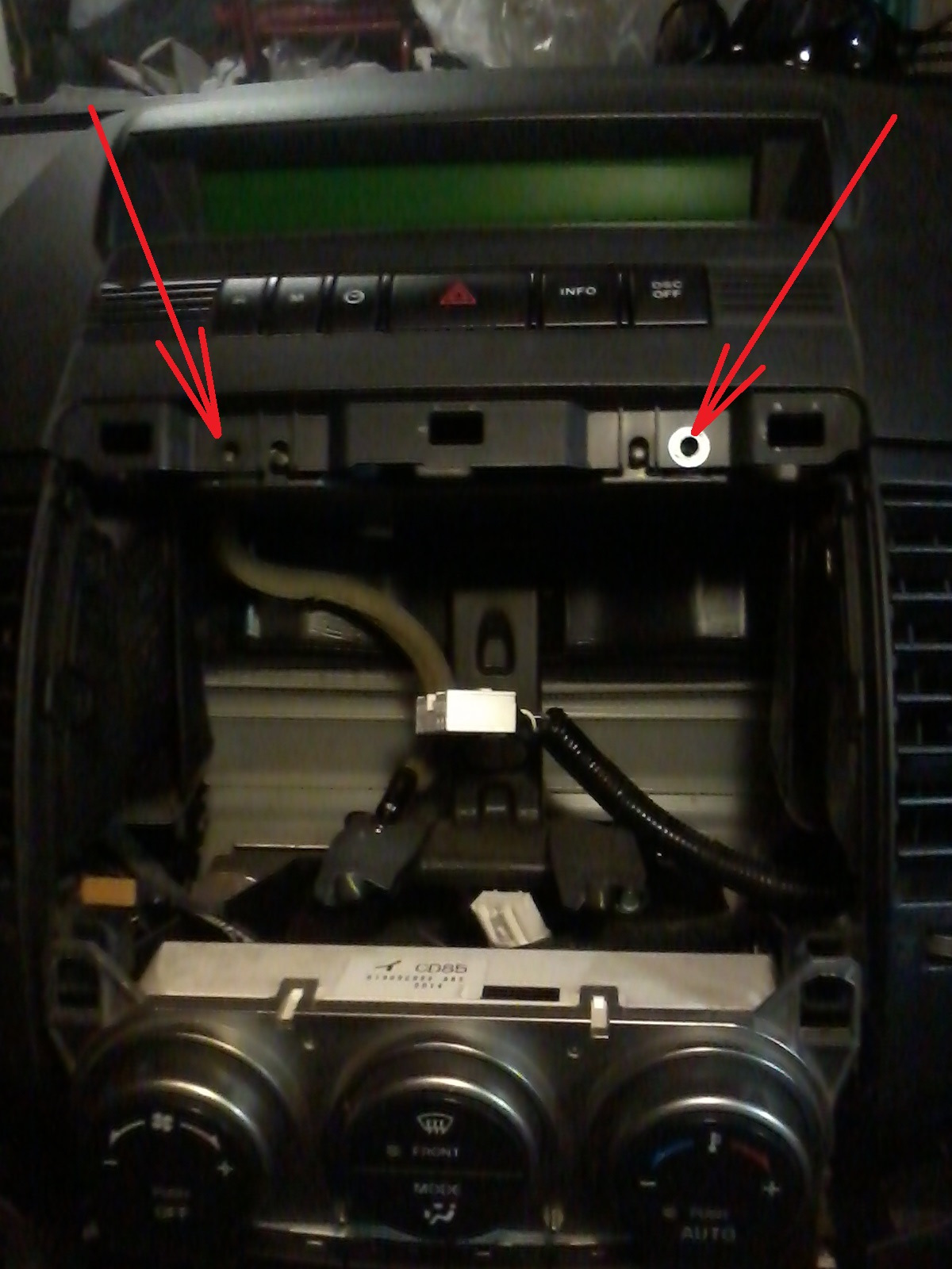 После чего сдергиваем вверх и на себя подиум (сейчас его держат только защелки). Дальше можно отсоединить разъем и прикуривателя и аудиовхода и убрать подиум совсем, но нам нужно только добраться до 2 саморезов под кнопками климат-контроля, поэтому я просто немного отодвинул подиум:
