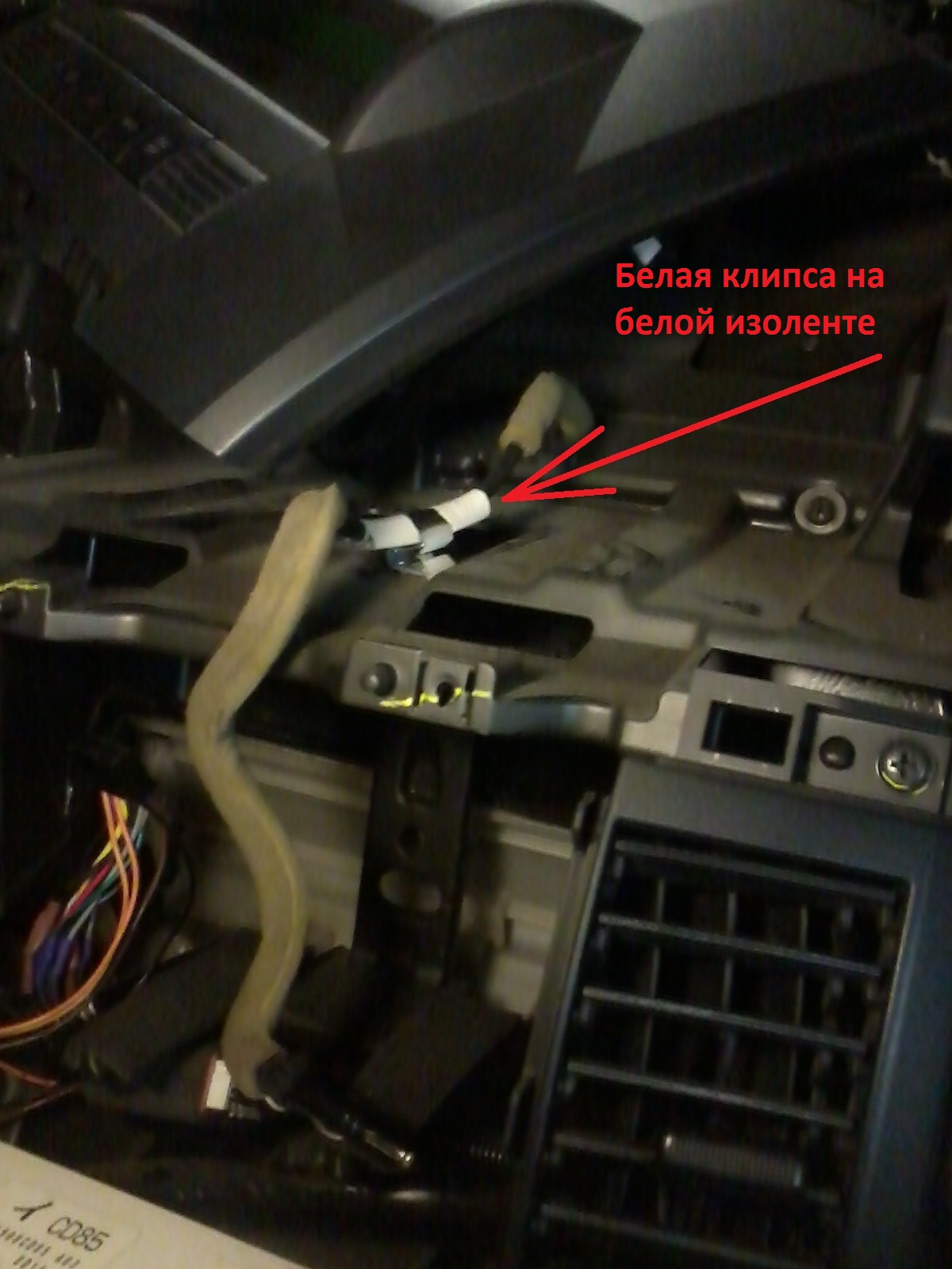Демонтаж верхней панели позволяет сделать нам 2 вещи. Во-первых перекидываем радоантенный кабель с левой стороны на правую (у новой магнитолы антенное гнездо находится с правой стороны). Антенный кабель удерживает маленькая белая клипса, которую надо отсоединить (она к нему просто примотана белой изолентой), перевернуть на 180 градусов и проложить антенный кабель по новому месту.