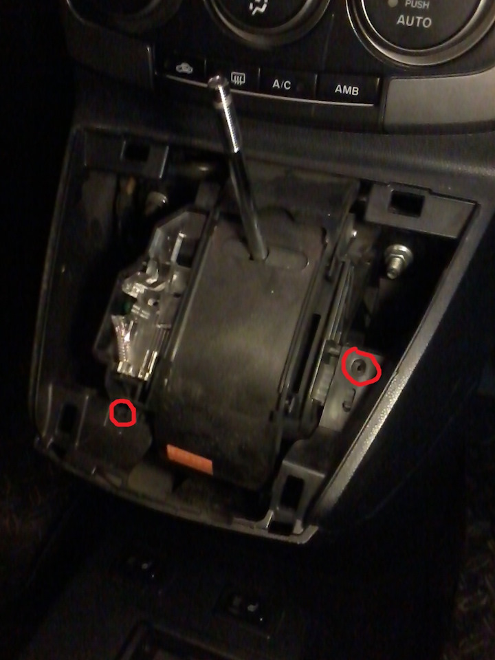 1. Подиум крепится еще двумя саморезами под накладкой ручки КПП.