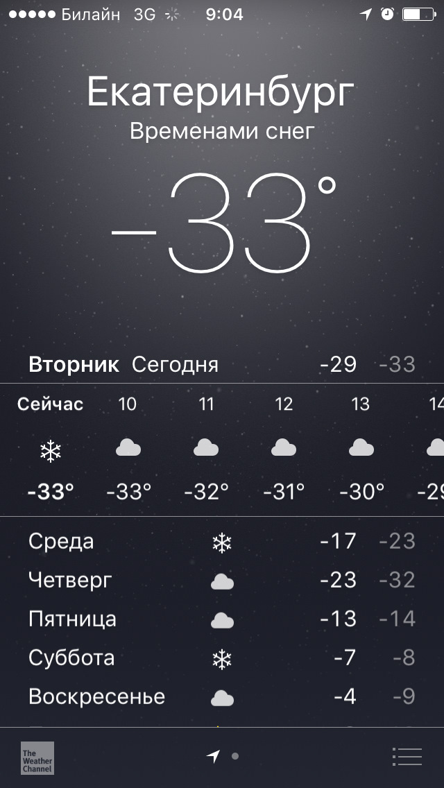 Сегодня утром телефон показывал -33 (охлаждение ветром до -43), в машине градация температуры идет только до -30, в реале было -35.