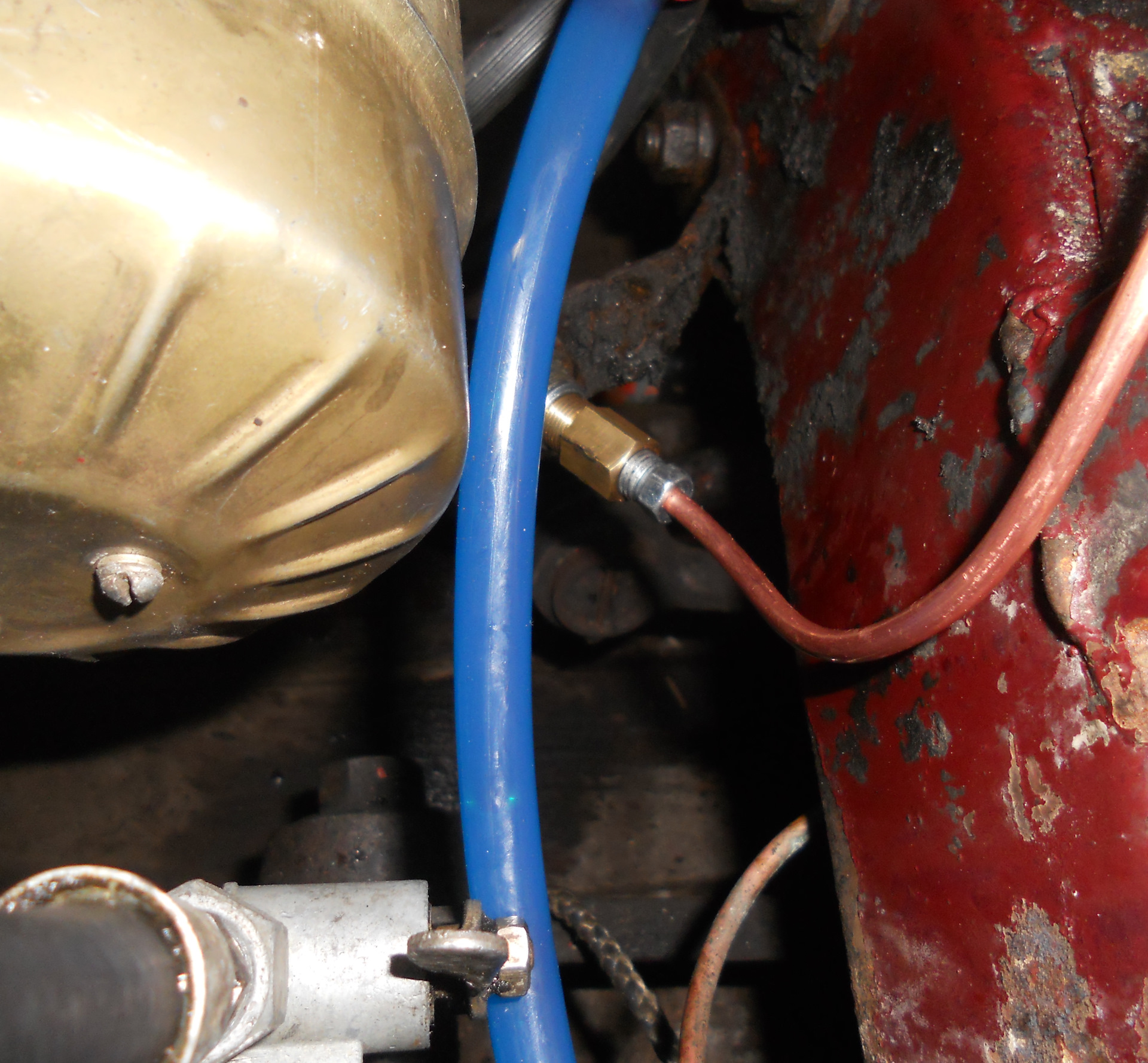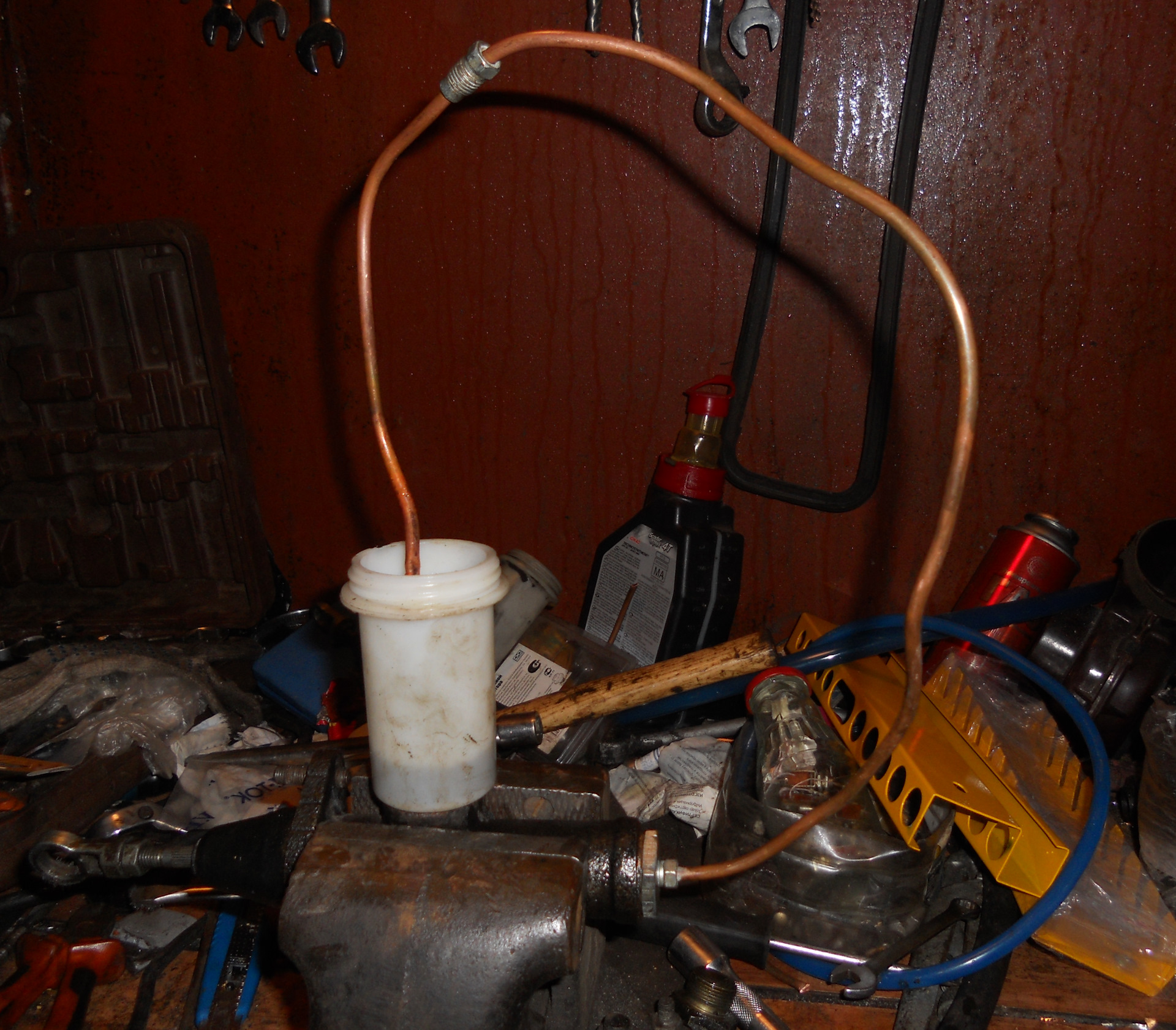 Неприличность первого варианта сборки заключалось не только в том, что сцепление не работало, но и в том, что медная трубка, которую я нашел была от системы питания и длина ее составляла метра два. Вальцевателя не оказалось в соседнем сервисе, я ее завальцевал путем разогрева газовой горелкой и молотка, гвоздя и так далее… Был конечно вариант лишние полтора метра на ВУТ намотать, но к чему мне такой змеевик под капотом?)