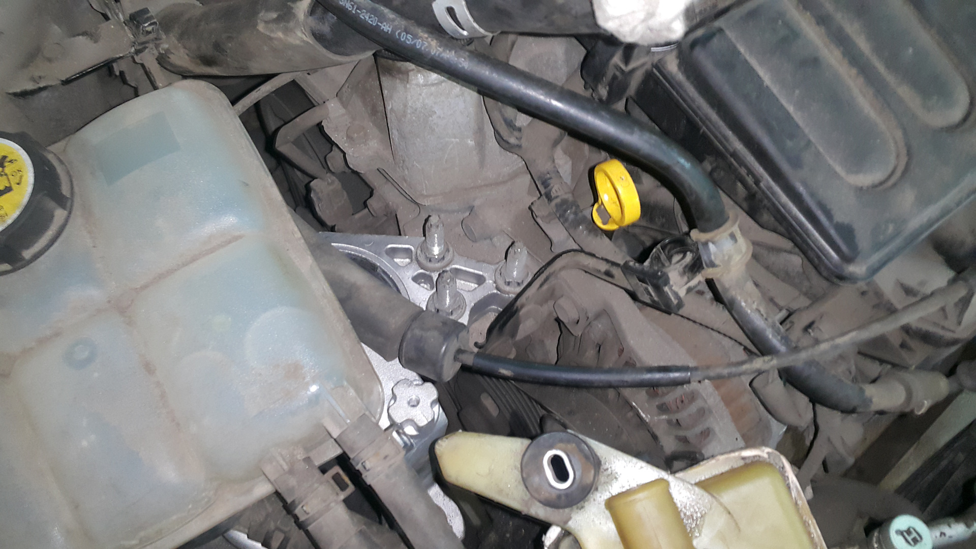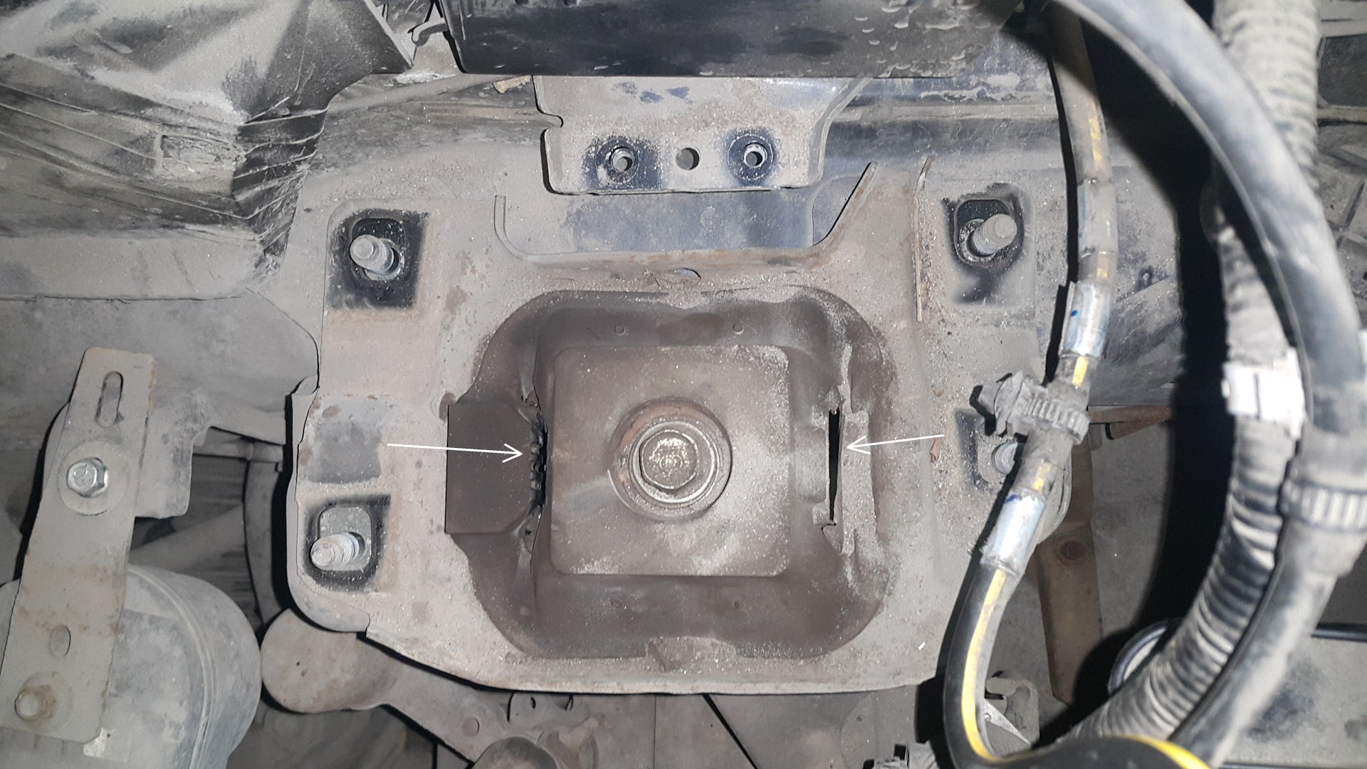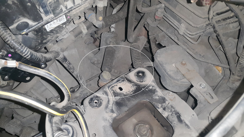 После снятия старой подушки, двигатель сыграл на пару мм вниз. Выправлять не стал из-за опасений за поддон, поэтому процесс фиксации новой подушки чуть растянулся.