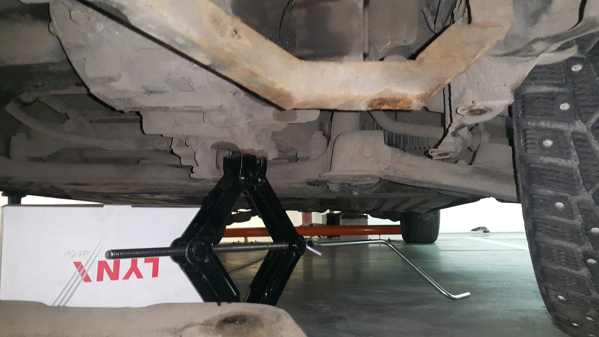 В моём случае без снятия защиты не обойтись (толстый металлический лист), но многим хватает повернуть колёса вправо, чтобы поддомкратить коробку. Другие домкратят саму защиту (в местах, где она находится близко к двигателю\коробке).