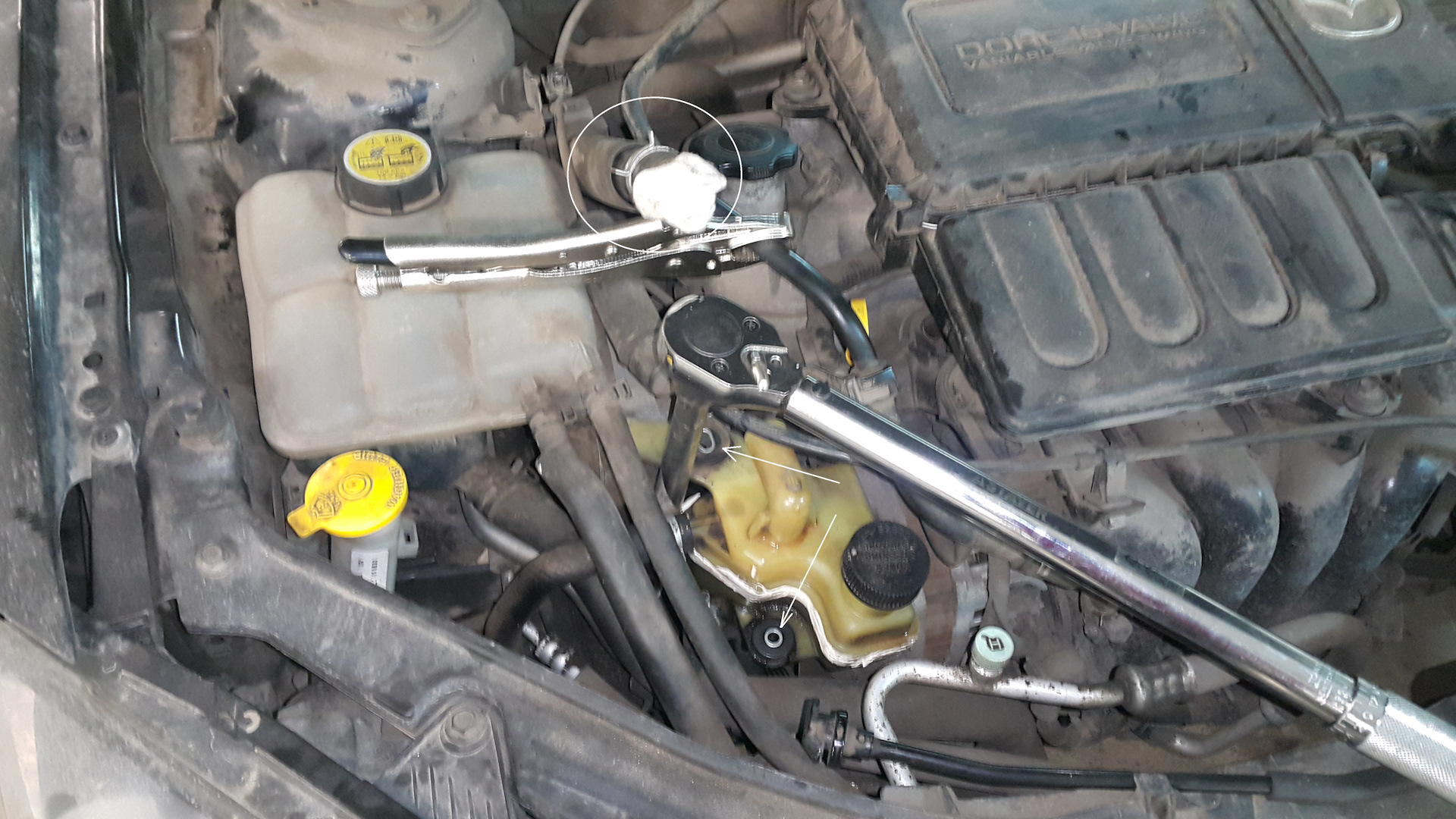2. Затем снимаем бачок с антифризом. Или грубой силой или поддев тонкой отвёрткой пластик у крепления рядом со чашкой.