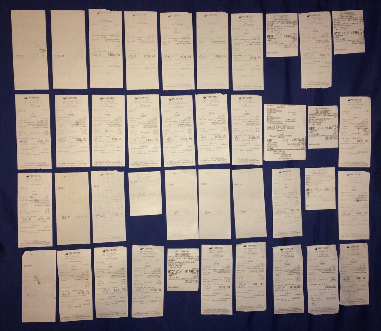 Во вторых, собственно, к теме. Как и было решено, в 2016 году я аккуратно собирал чеки с заправок и складывал их сюда. Получилось вот что:
