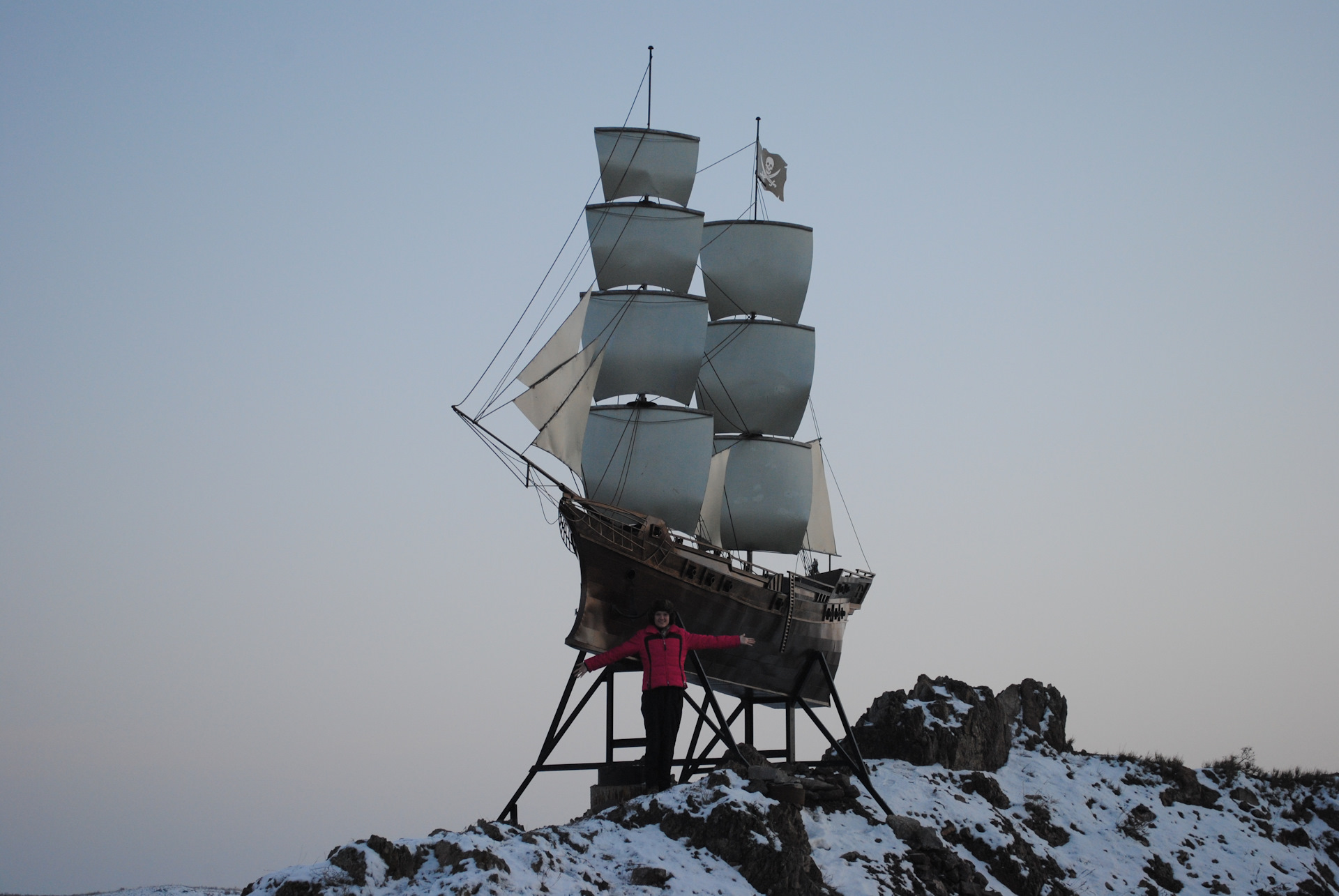 Супруга все хотела сфотаться возле корабля на Капчагае, но все время пролетаем его в сумерках или ночью, в тот день успели до заката.
