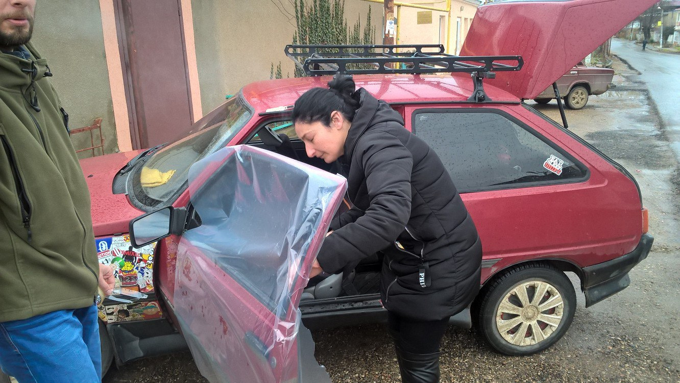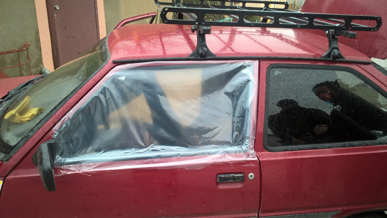 На рабочей таврии перестало закрываться до конца пассажирское стекло решил подогнуть монтировкой механизм всё это было зимой стекло громко хрустнуло и посыпалось в дверь, взяли мусорный пакет и в 3 слоя скотчем приклеяли так проездили наверно неделю пока не купили новое стекло, ездить было жутко неудобно зима ещё 3 слоя пакета обзор был никакой)))