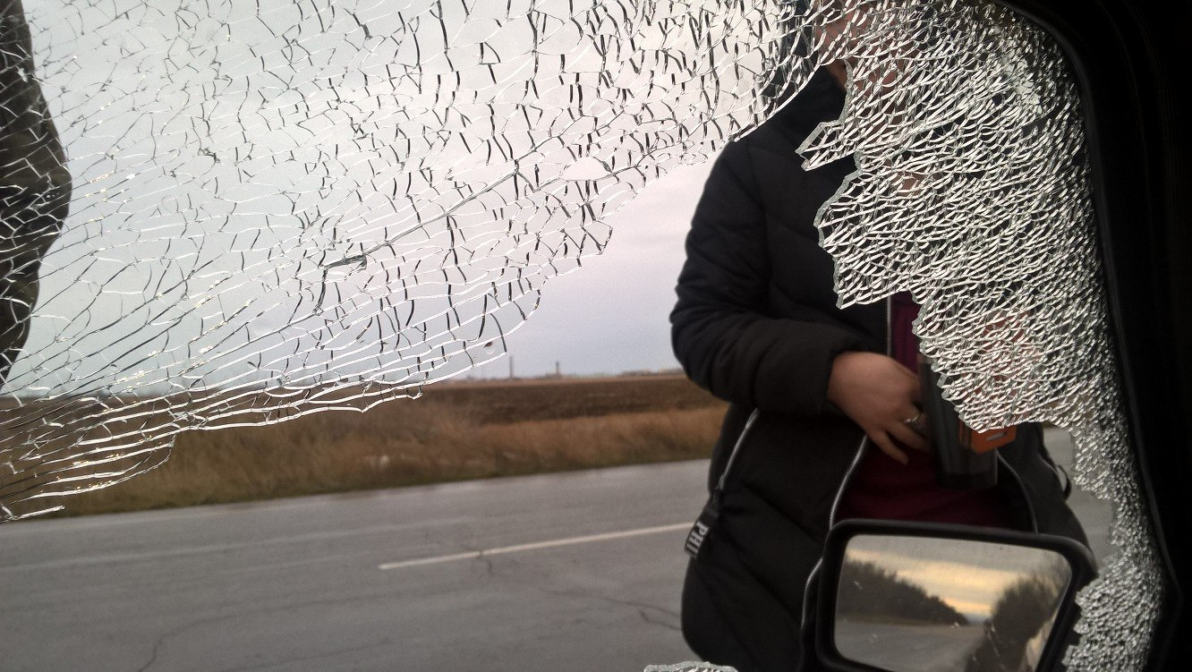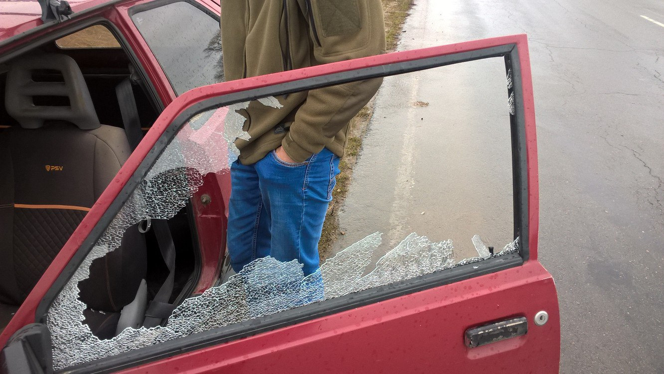 И что это было? Толи камень выскочил из под колеса встречной машины, толи еще что. Сомневаюсь что кто-то развлекается стрельбой с пневмата по встречным машинам. Но постороннего предмета, разбившего стекло, в салоне не было обнаружено. Выбил остатки стекла, сгреб все с дороги, и поехал в ближайшее село за скотчем и пленкой.