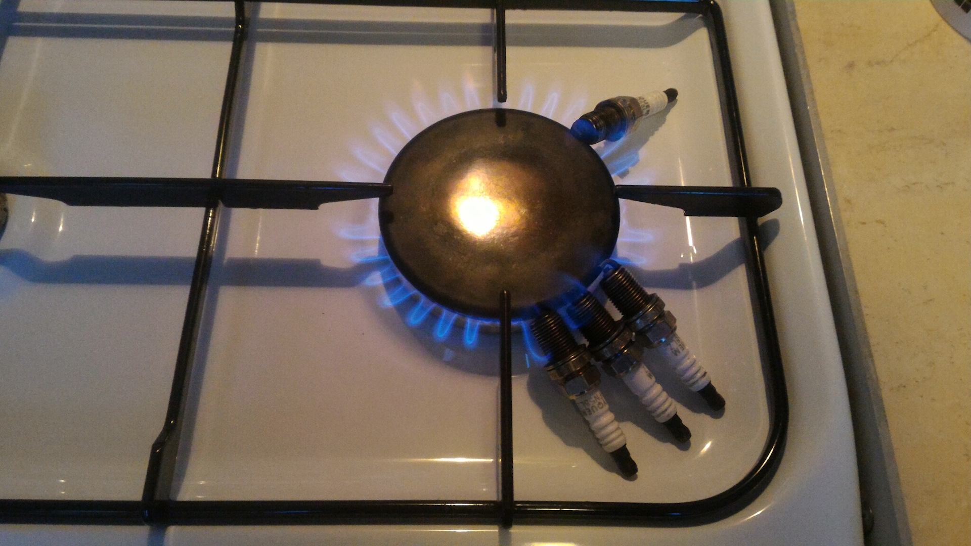 Почистил свечи ветошью, смоченной бензином, затем нагрел/просушил на огне (20 секунд, не более). Долго держать свечи на огне не рекомендую — можно их испортить.