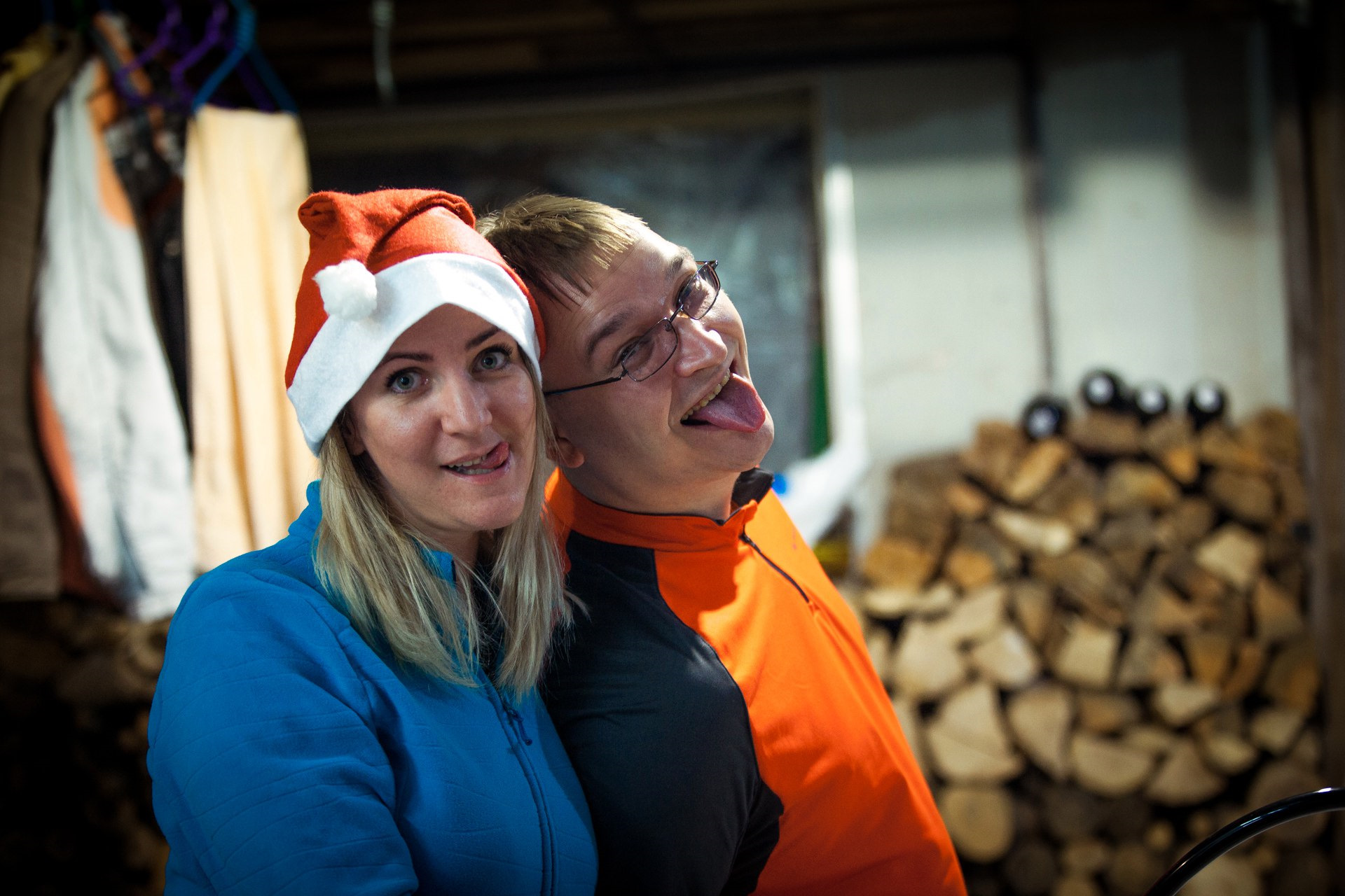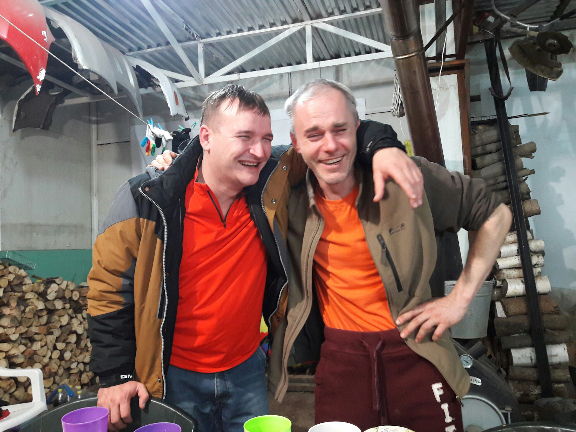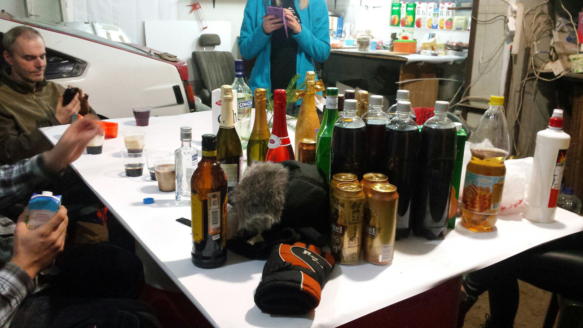 По приезду стал протапливать мастерскую для празднования и остальные норки для ночевки. Сделал стол из двух бочек, листа плоского шифера и баннера, почистил крышу, настрогал ведро зимнего салата и стал ждать гостей. К семи вечера 31 числа они приехали ))) И привезли напитки для празднования ))