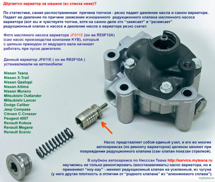 Вот ниже картинка по замене этого самого редукционного клапана (на чугунный). И интересное видео с ютуба по разборке и дефектовки этого же самого вариатора (с пробегом 416 000 км на Ниссан Теане), реальных повреждений мало, что доказывает тот факт, что на самом деле этот вариатор очень надежный и ремонт его недорогой.