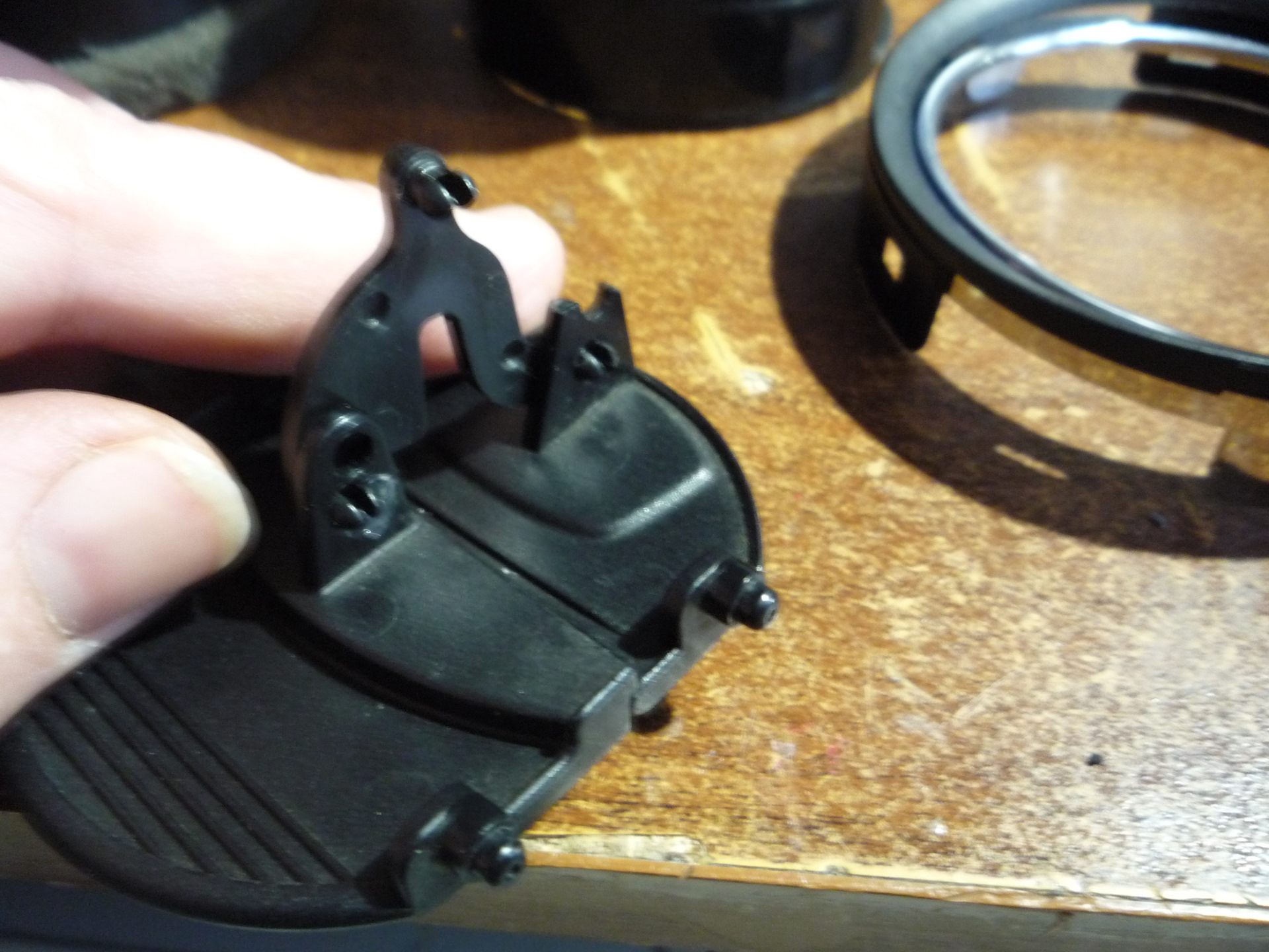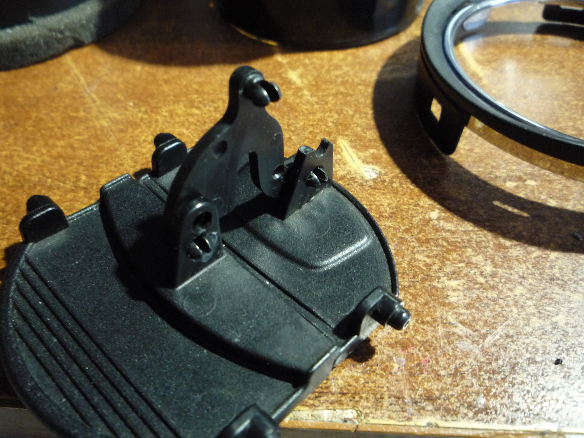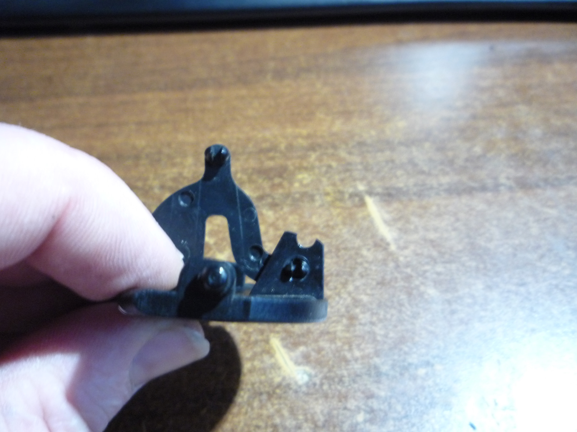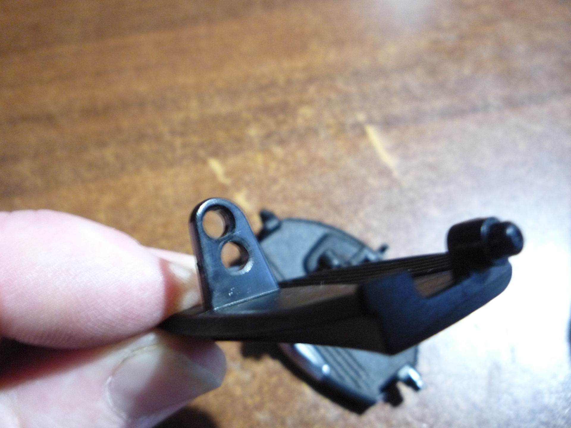 вынимаем поводок (рычажок) из кронштейна-аккуратно!-ABS пластик хрупкий!и по сохранившемуся целому отверстию подбираем сверло "в хозяйстве" таким же диаметром, или чуток больше-это можно но не на много.0.1 десятки вполне хватит…и тупо ниже сверлим похожее…