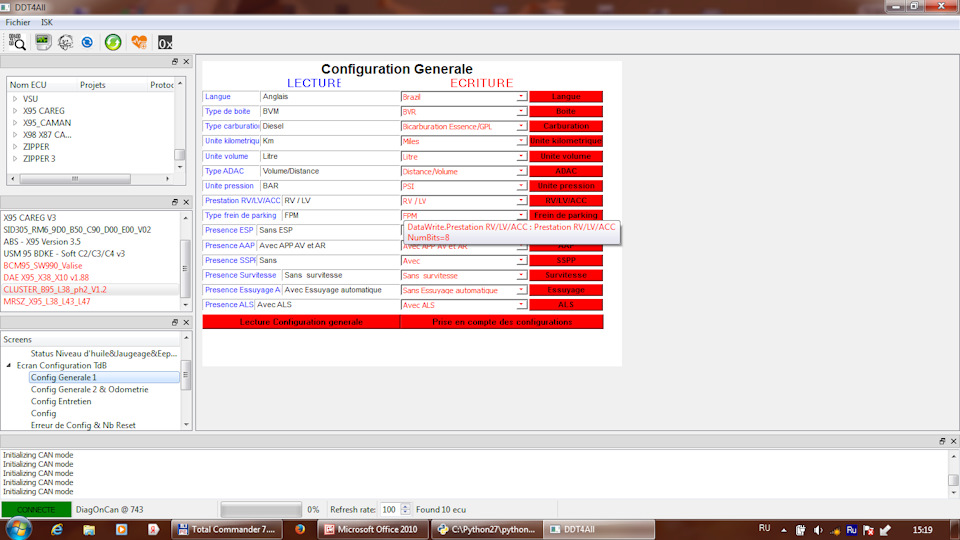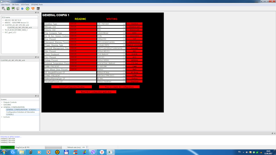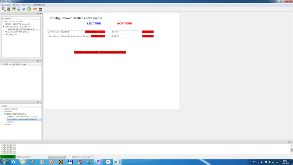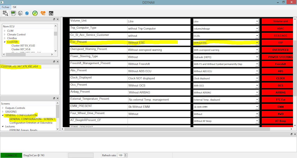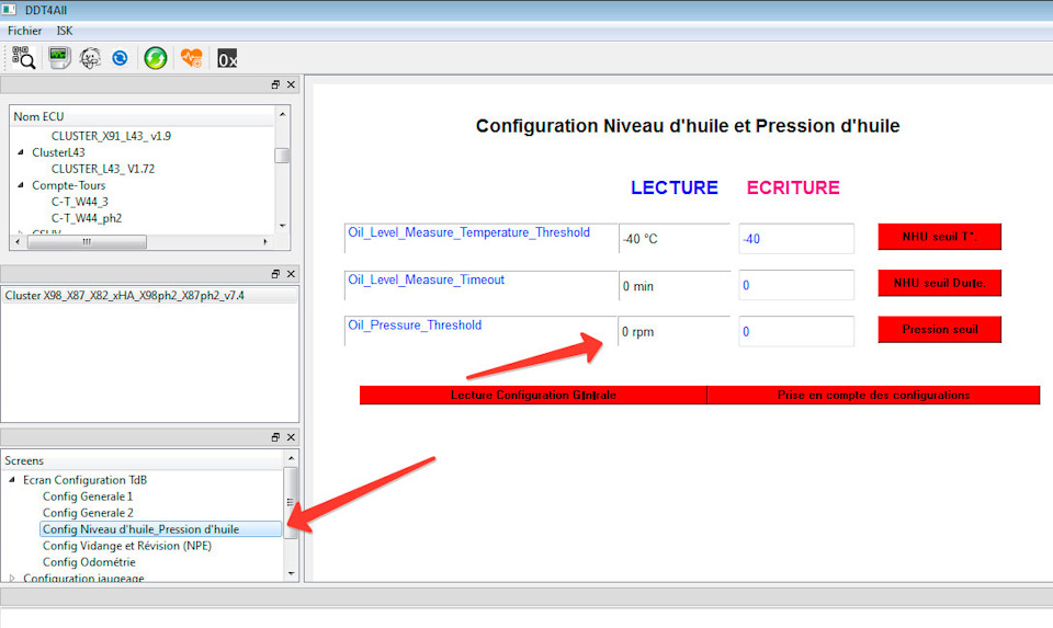 Изменить это значение можно c помощью ddt4all. В строке Oil_Pressure_Threshold. Нужно заменить 2000rpm на 0rpm и сохранить. Далее нажать на кнопку Prise en compte des configurations, после чего приборная панель перезагрузится уже с новыми параметрами.