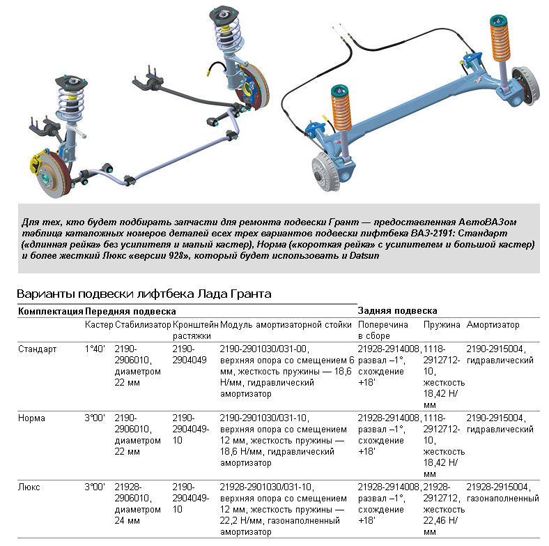 Закралась идея собрать себе на Калину переднюю подвеску от Гранты поскольку левая заводская стойка уже мокрая да и правая на подходе. Очень долго копался на форумах, гугле и каталогах чтобы воссоздать все как оно есть в оригинале и куда копать.