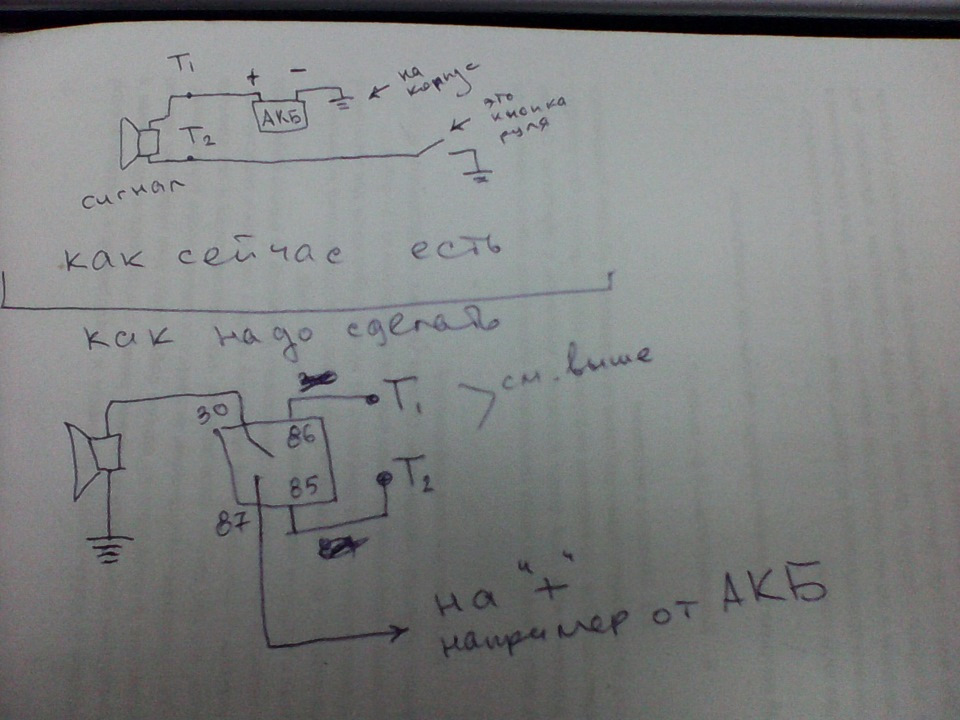Маленькое замечание: Там на электрической схеме, на участке "как надо сделать" обязательно внедри предохранитель между "+" АКБ и контактом 87 реле. Ибо любое замыкание в районе дудки приведет к выгоранию реле или проводофф…