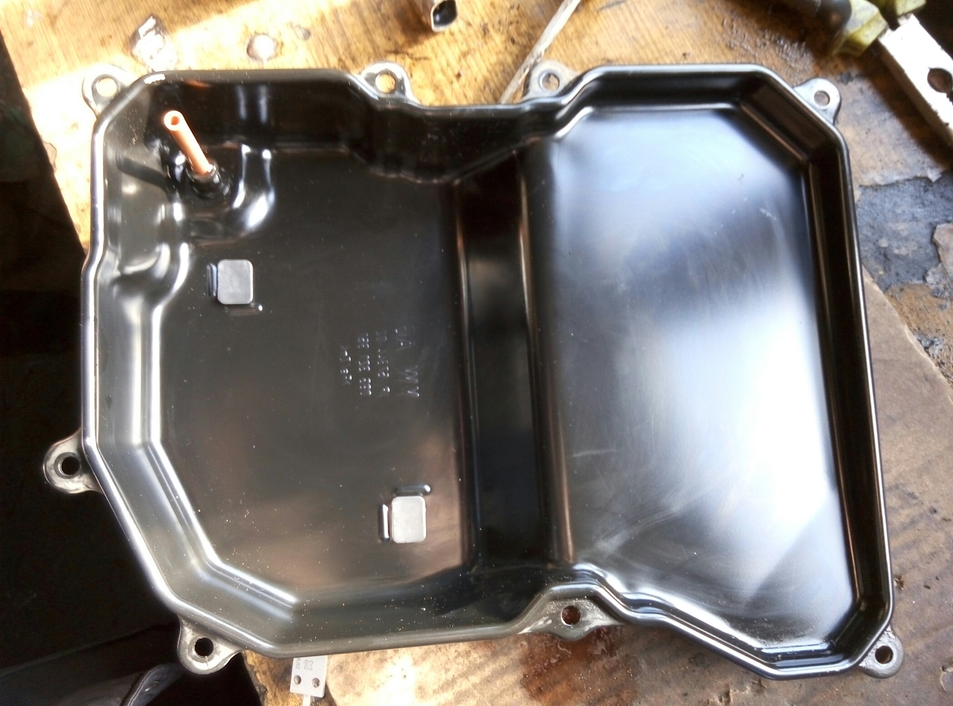 Приспособу для заливания сделали из старой пробки поддона, просверлили запаяли кусочек трубки и одели на него шланг, шприцом закачивали.