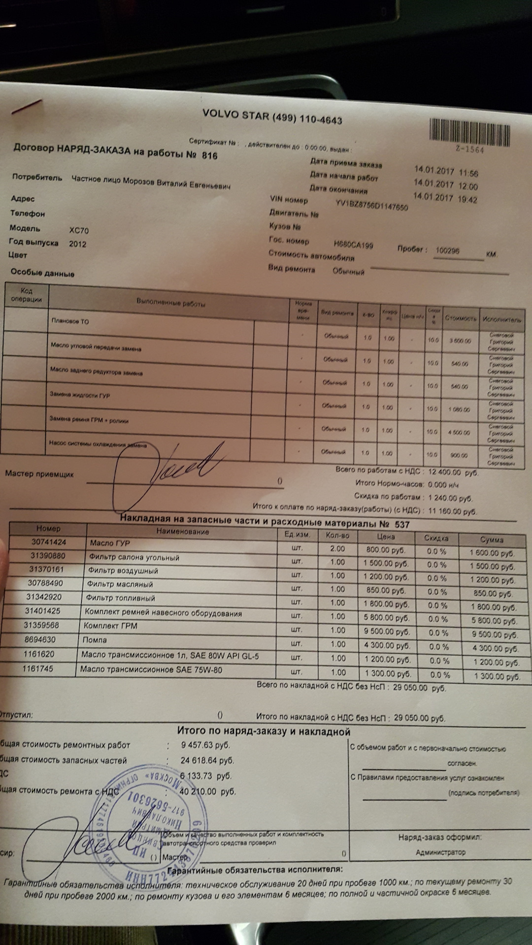 С учётом того, что 6 литров Мотюля (3775 руб. с доставкой) привёз сам, всё ТО обошлось в 40 210 рублей. Считаю за такой объём проделанных работ ценник более чем адекватный.