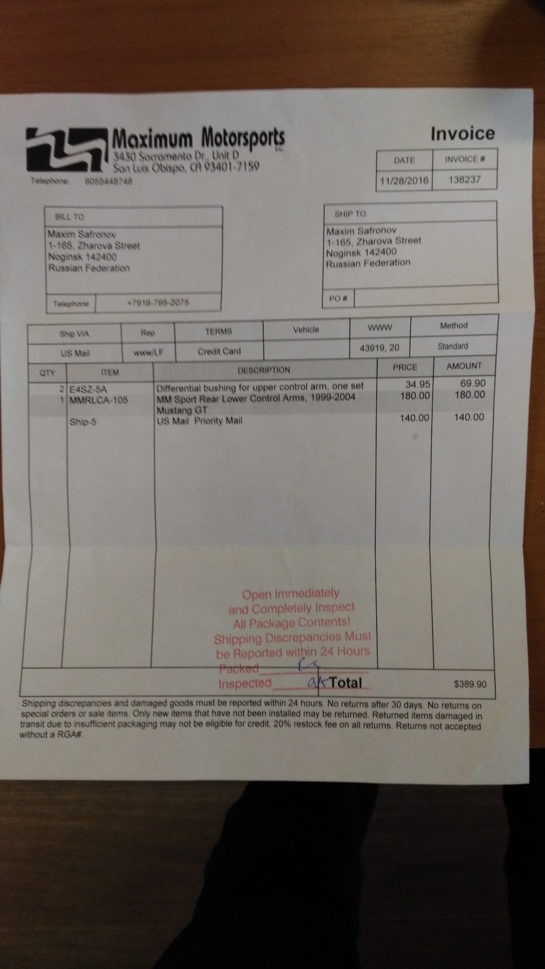 Сама процедура оплаты заказа отличалась от привычной мне, сначала сняли деньги чисто за запчасти и через несколько дней написали на эл.почту письмо, что доставка для меня обойдется в 140$. И тут начались проблемы с оплатой, просто перевести им деньги я не могу, нужен счет или заказ, а сам заказ уже оплачен а они счет отдельно за доставку не выставляют. Типо тупик, пишу им, чтобы выставили счет на любую запчасть равную 140$, и везут мой заказ. Они практически так и сделали, прислали инвойс в мой аккаунт, в котором я должен был проставить количество единиц заказа 140 по цене 1$. в целом всё прошло в итоге хорошо. теперь буду на следующий раз знать как они работают.