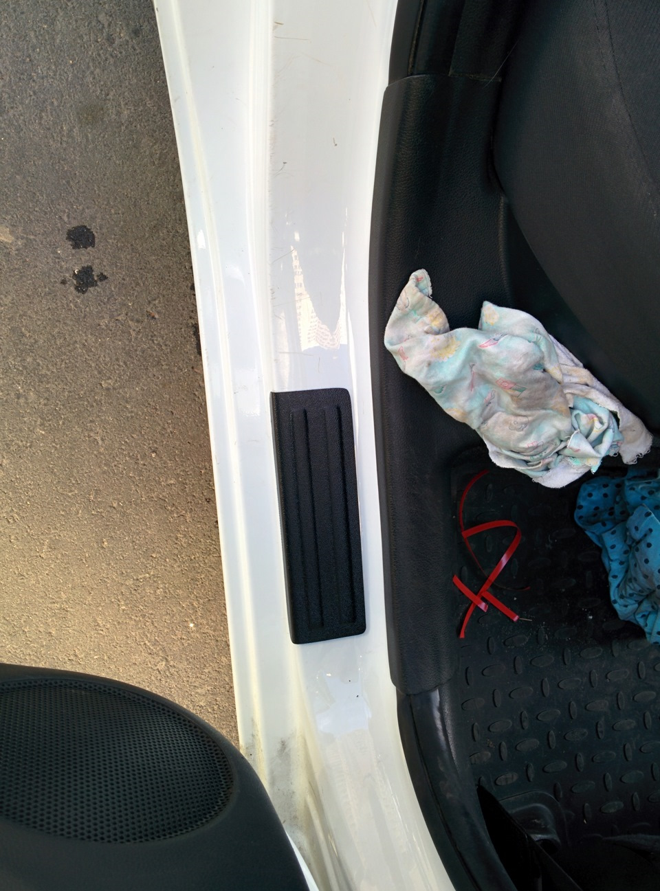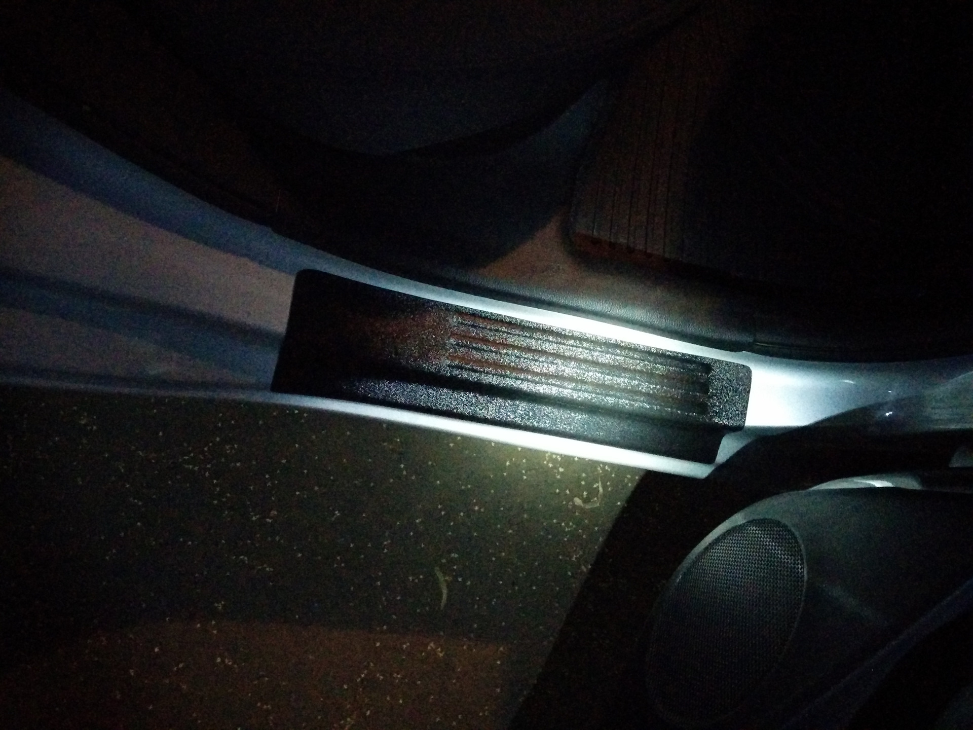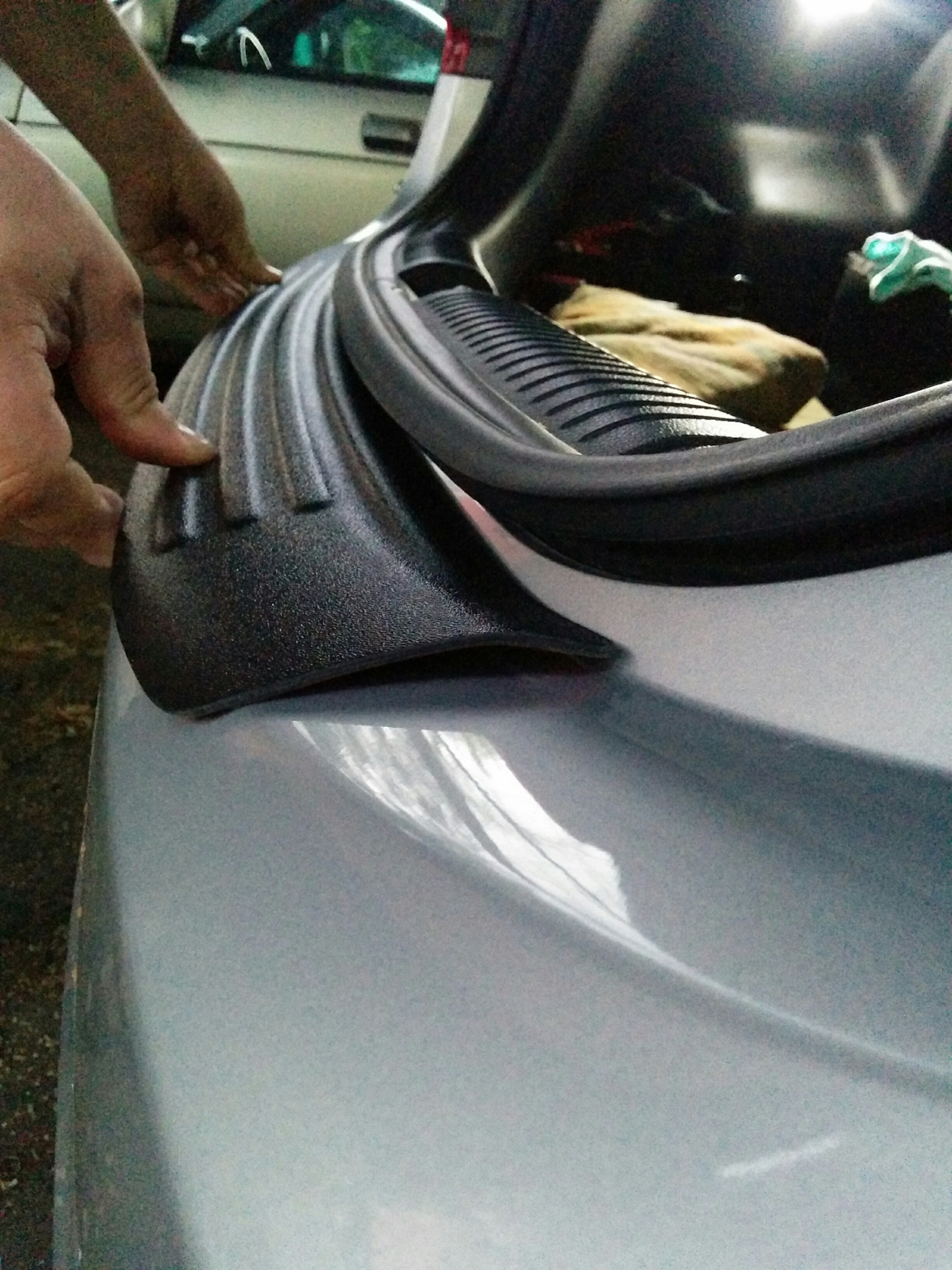 И вот примерно спустя полгода nommep зовет меня в гости что бы приклеить себе накладки на пороги и на бампер. С накладками на пороги проблем не возникло (кстати, они стали гораздо больше, посмотрите на фото), а фот накладка на бампер не подходила, как не крути.
