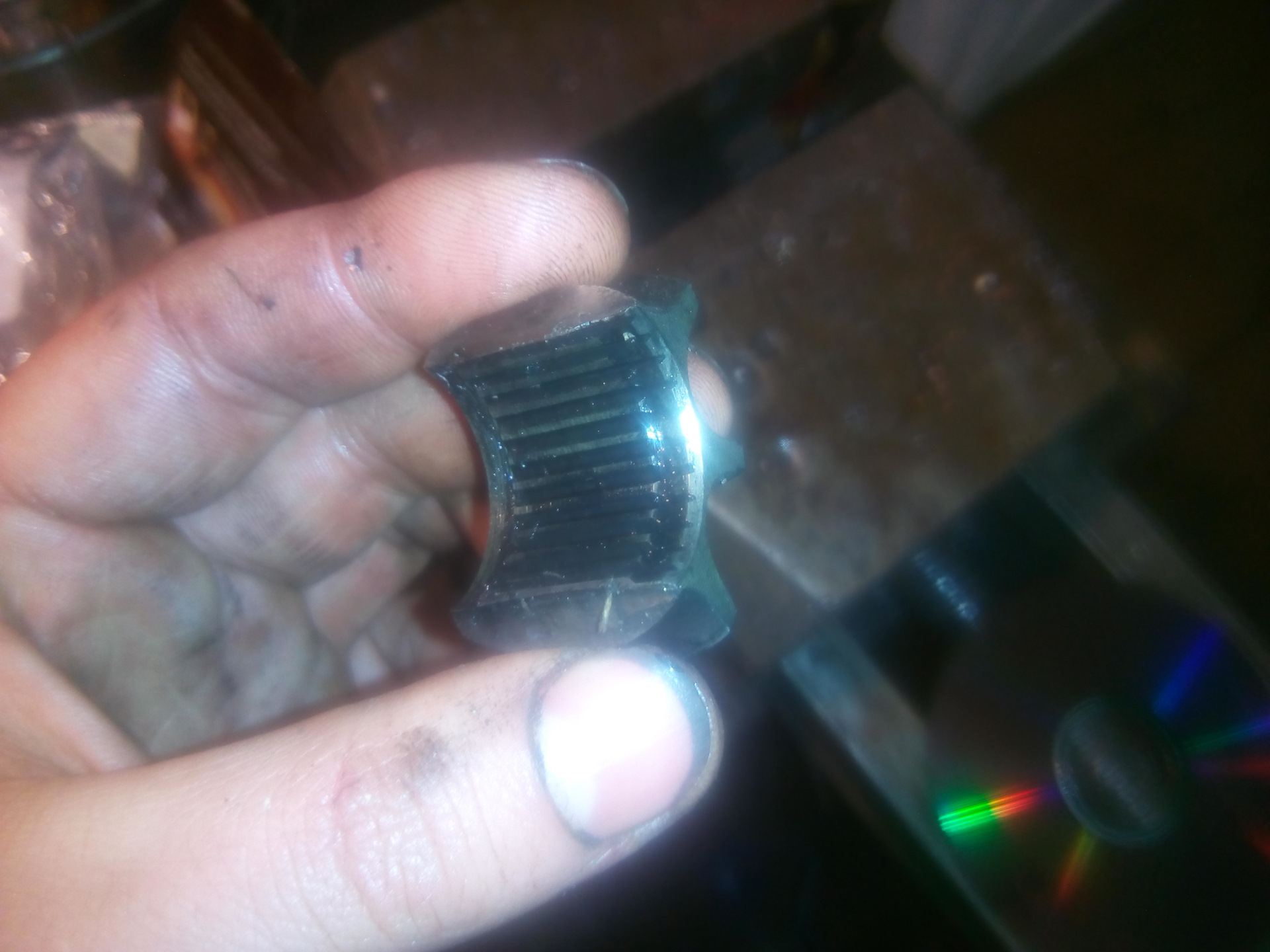 Ее перепиливаем в 4 местах вдоль. Пилим аккуратно чтобы не повредить шлицевую часть вала. Сделав пропилы подставляем под нее что-то жесткое, ставим зубило в разрез и раскалываем внутреннюю часть шруса.