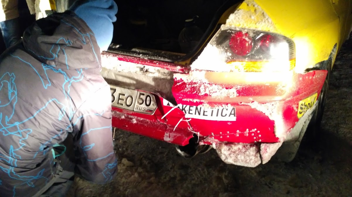 Но на 3-м началось! Через полтора км от старта Лехе стало плохо и я поехал по глазам переодически поглядывая на него, доедет ли до финиша или нет, в итоге в знаковом месте имени Андрея Прокудина и Алексея Приступы, переборщил со входом в правый поворот, оказался на середине дороги, начал поворачивать, но побоялся что воткнусь во внутренний земляной бруствер, немного отрулил, но повернуть уже толком не успел, тк передняя подвеска разгрузилась, из-за этого уехали наружу, ударились задней правой стороной, машину подбросило, разбортировалось колесо. Кое-как доехал до финиша СУ, Леха приходил в себя на улице, я менял колесо. СУ4 поехал отыгрываться, все шло неплохо, но в одном месте ошибся с торможением буквально на пару метров и немного заехал на бруствер, съехали сами потеряли около 10 сек. Из-за всех этих передряг мы потеряли около 30 секунд и откатились на 3 место.