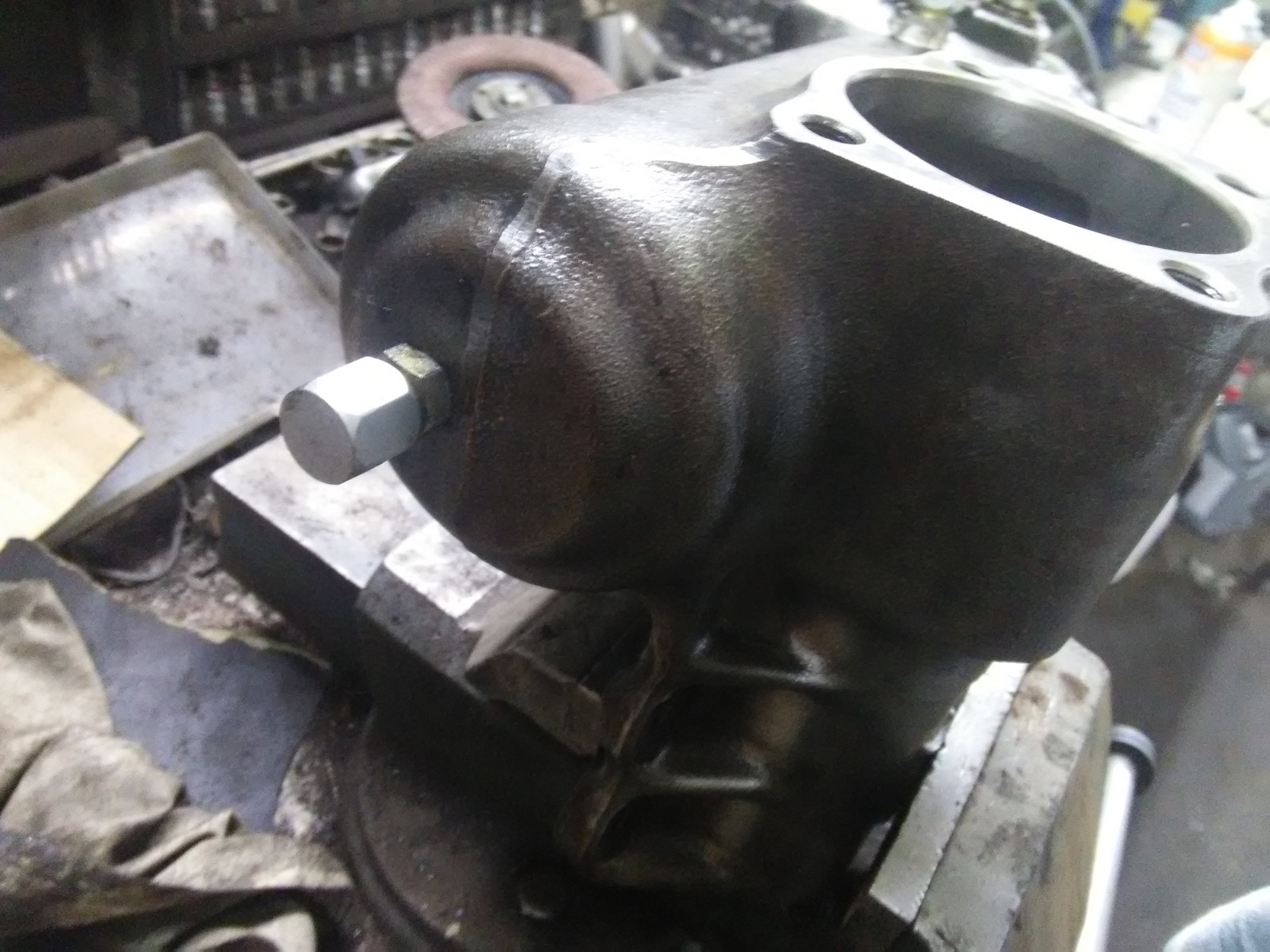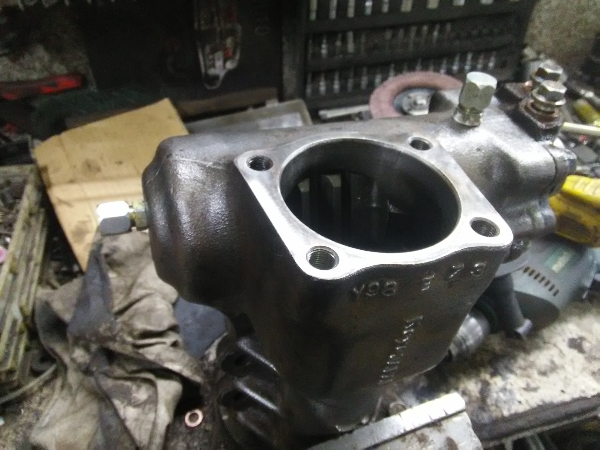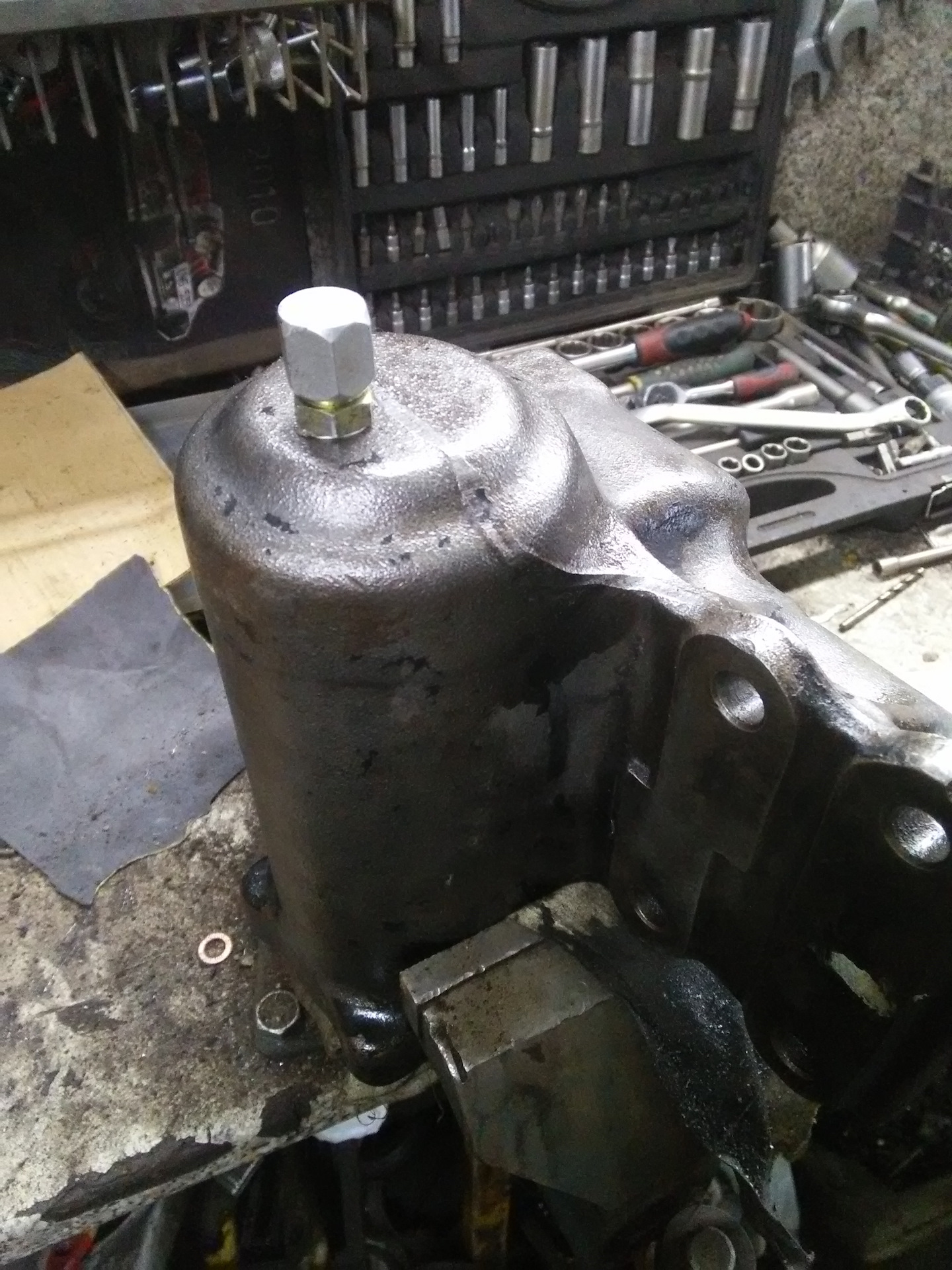 Далее. Для подключения гидро ассиста необходимо просверлить тулово редуктора, чтобы поставить штуцеры для перепускания жидкости. Для этого внутри тушки были обнаружены камеры, в которые и закачивается (или откачивается) жидкость, когда редуктор понимает, что прокладка хочет ехать вправо или влево. С одной камерой проблем нет — она покрывает почти весь периметр туши, а вот со второй пришлось повозиться. В общем, просверлил в пятаке одно отверстие, другое сверху, нарезал резьбу 14х1.4, намотал фум на штуцер из Трамполэнда, вкрутил поглубже и собрал все обратно. Свои труды я не мог не отметить и, чтобы ремонтную (читай новую) деталь сразу было видно на авто, все почистил мохряткой и покрасил кисточкой.