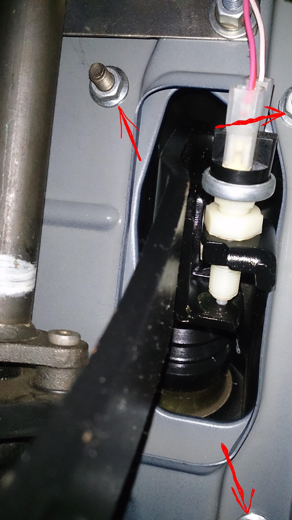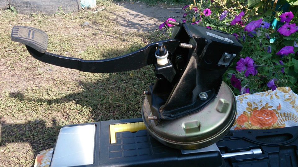 Перемещаемся в салон. Ключем на 13 откручиваем 4 гайки над педалью тормоза. Отсоединяем провода от "лягушки"