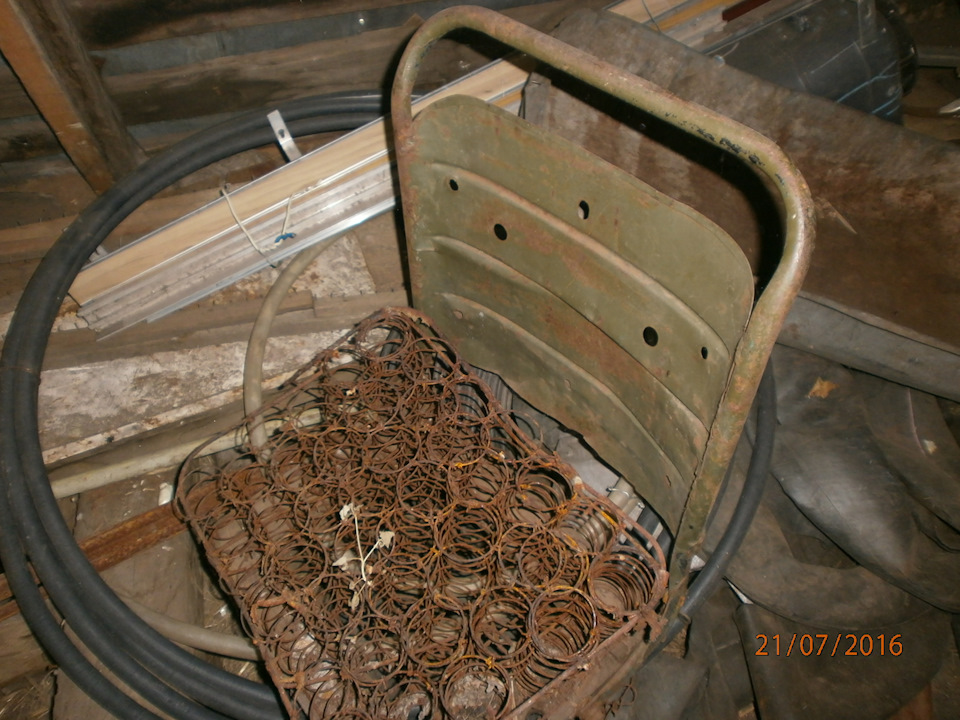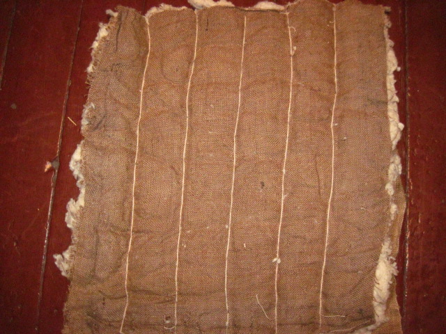 2)Ватник оплетает пружины сверху. Состоит из куска мешковины и 4 см. ваты прошитые простым однонитчатым швом(воспользовался более поздним чертежом как более практичным где используется 2 куска мешковины). Здесь всё оказалось даже проще-нашёл на свалке старый диван-распорол, постирал, сшил обратно. Ватник точно такой же как и использовался для автомобиля(даже толщина и расстояние между строчками одинаковой!)-видимо тогда не заморачивались и взяли готовый образец из обычного дивана.