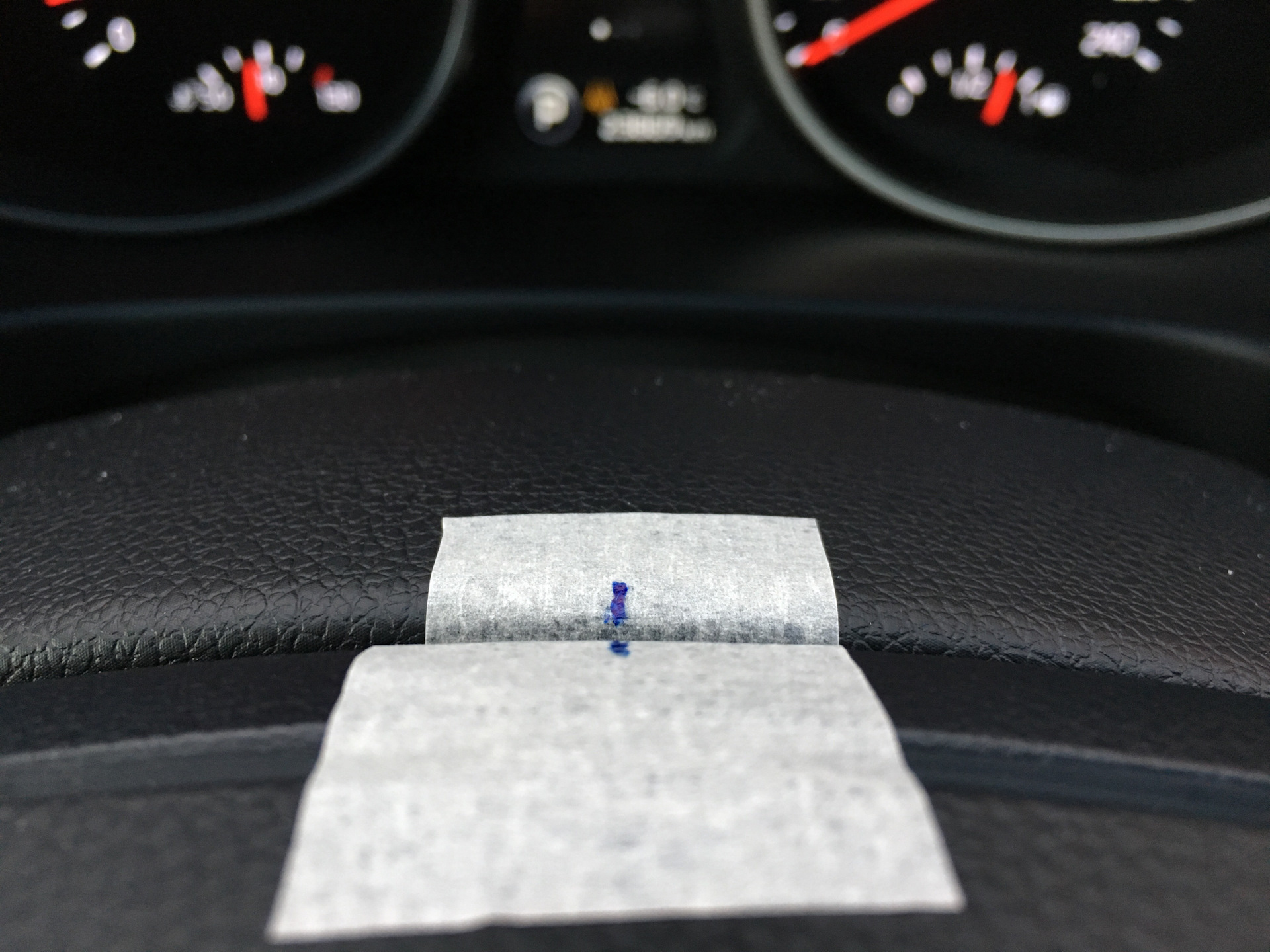 Т.к. ни глазомеру мастера, ни своему глазомеру я не очень доверяю, поступил следующим образом, наклеил на руль и кожух руля молярный скотч, на ощупь выровнял руль и нарисовал 2 черточки на 2-х кусках скотча (напротив друг друга). Несколько раз менял положения руля и снова проверял, напротив ли черточки при центровке руля…