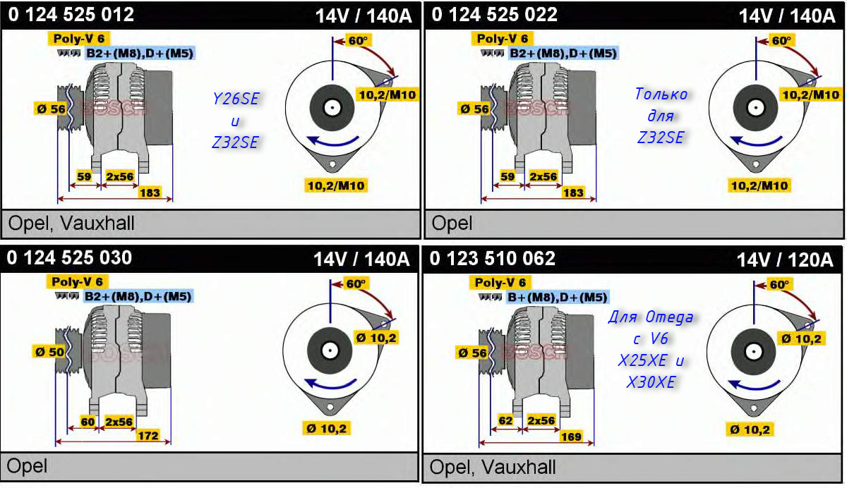Самые близкие артикула к нашим V6 это 0 124 525 012 и 0 124 525 022, оба генератора одинаковые, только …012 судя из каталогов устанавливался на оба двигателя, а вот …022 только на Z32SE, оба устанавливались с первых дней по окончание выпуска модели вектра С. С этими данными круг поиска уже облегчился, был найден …022, но поляк был не особо сговорчивый, покупка не сложилась (к стати он так и висит в продаже). Так же есть в продаже 0 124 525 030 не помню с какого он двигателя вроде с астры турбодизель 2-2,2л.