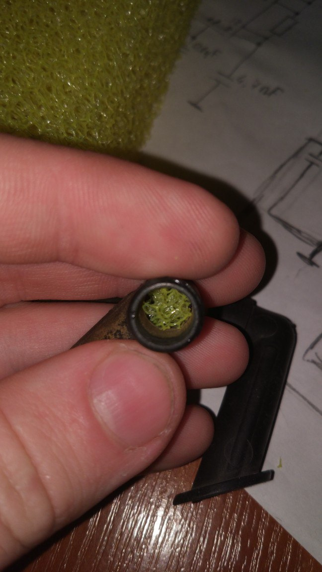 Сняв голубой орнамент и все шпильки, начал чистку. Провод (или два провода, в зависимости от удобства) сгибаем пополам и в место сгиба вставляем ватный диск. Смачиваем в спирте — и сгибая как надо, чистим стекло внутри!