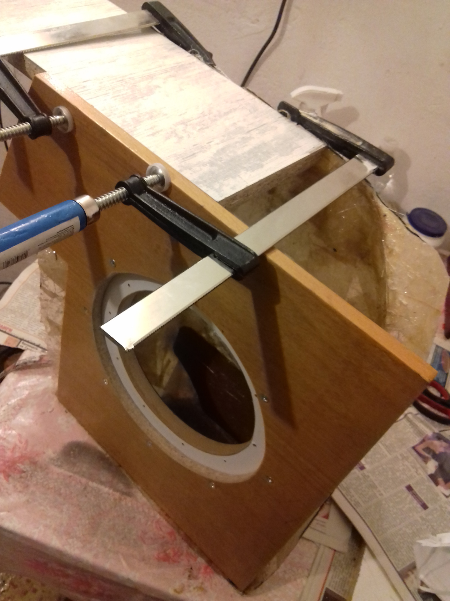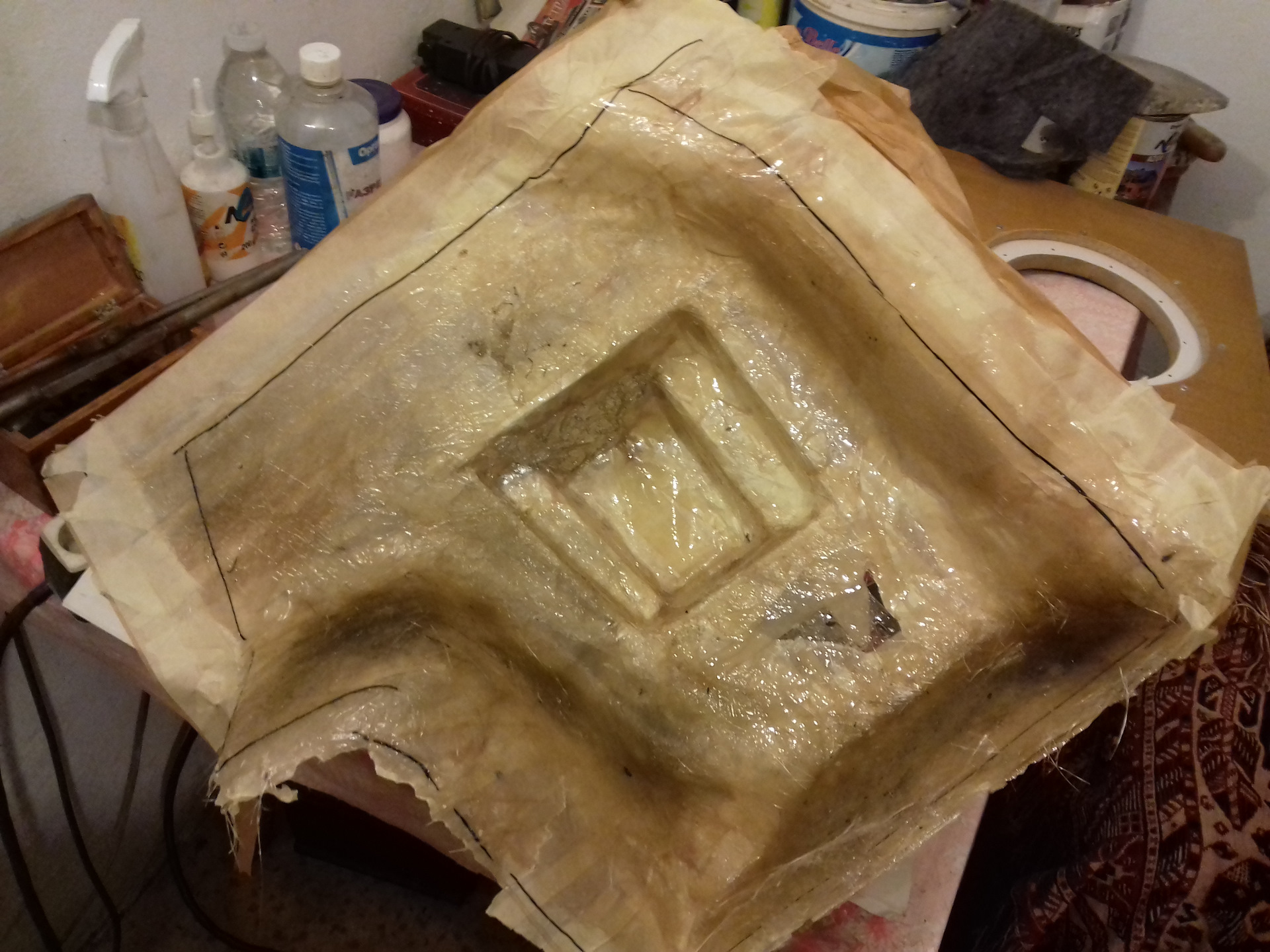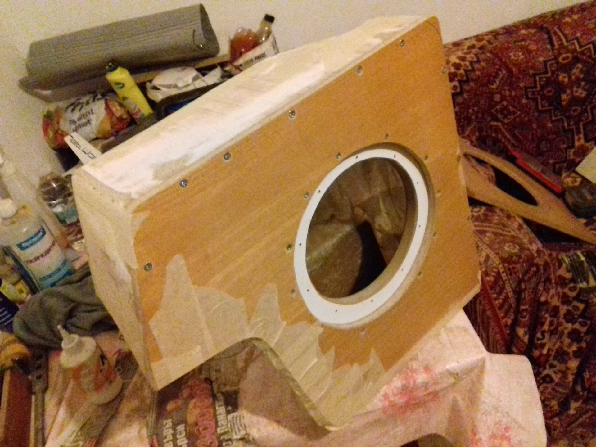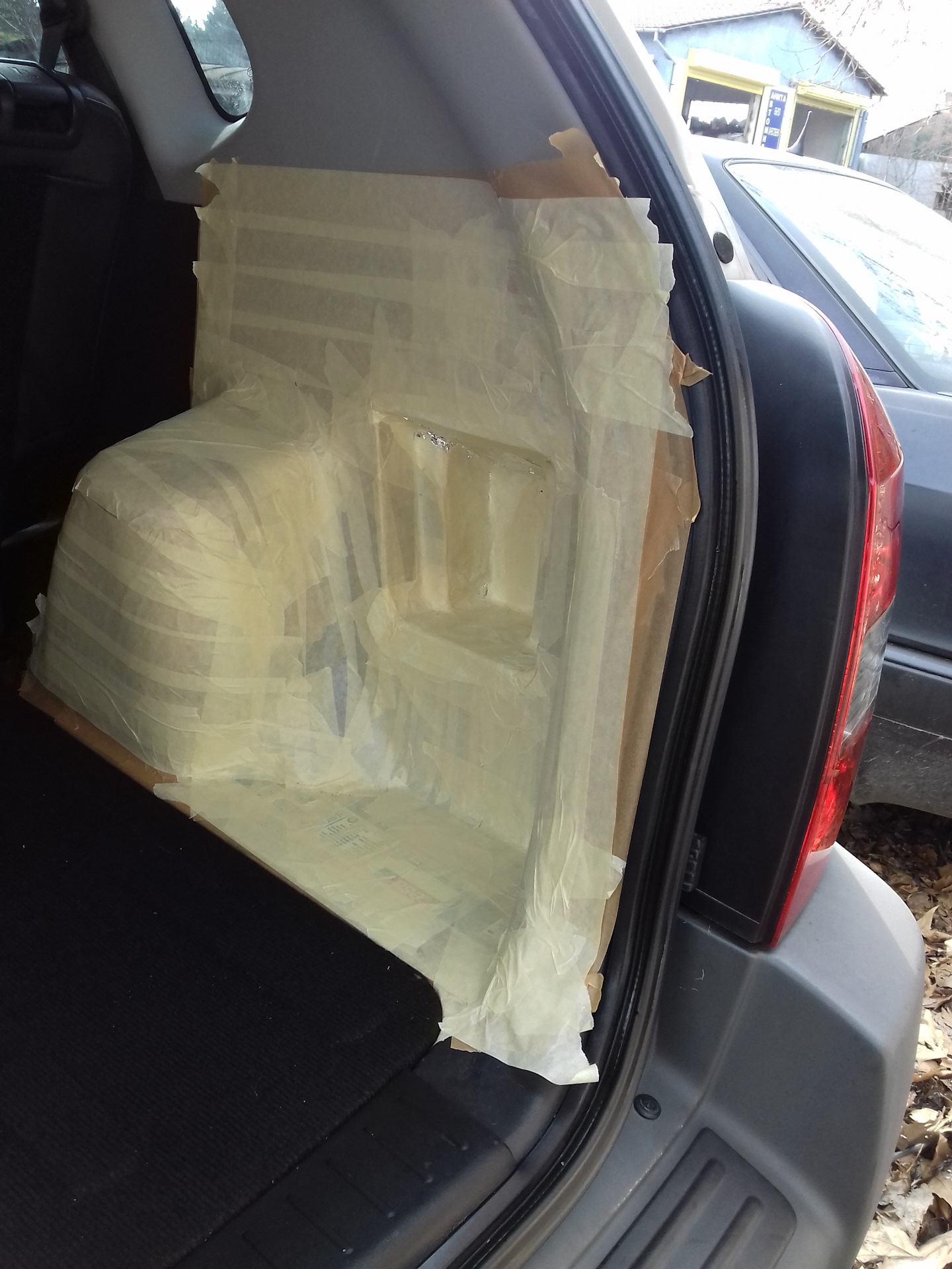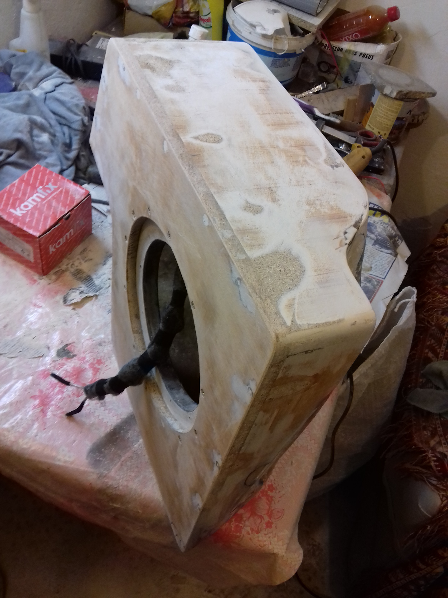 Простите мой русский я из Болгарии. Многа читал здесь на сайте, и я решил сделать коробку для сабвуфер из полиэфирной смолы для усиления низких частот. Я использовал Herz es 200 /8 инча/ и усилитель Mac Audio МP2000 /ставил его при запасное колесо/-они остались из старая машина. Купил 3кг смола а стеклоткань дал мой друг, и начал:)