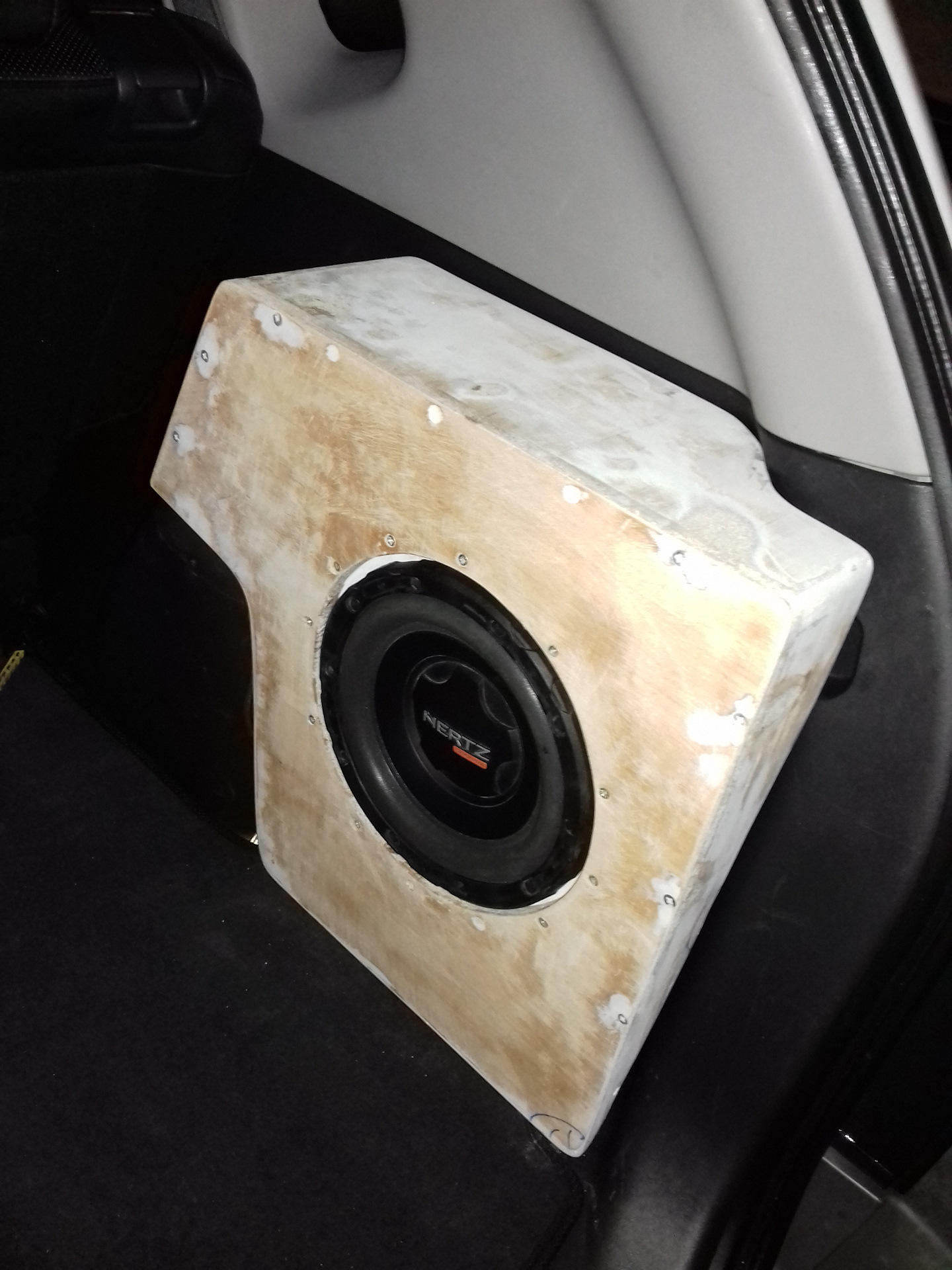 ES 200 осталься от старая машина Ауди а4б5 facelift.Там он бьiл в объём 11,5 л в коробке из MDF 20мм звучал более хорошо.Низкие тони бъiли сильнее, возможно из за кузов машине, не знаю.Коробка бъiла квадрат с покатой задней, спрятан в скрытый в левой нише в багажном отделении.Моя идея, и здесь и там, состояла в том, чтобы ничего не вырезано.Новъiл владелец моя машина не узнал что она бъiла с музике.