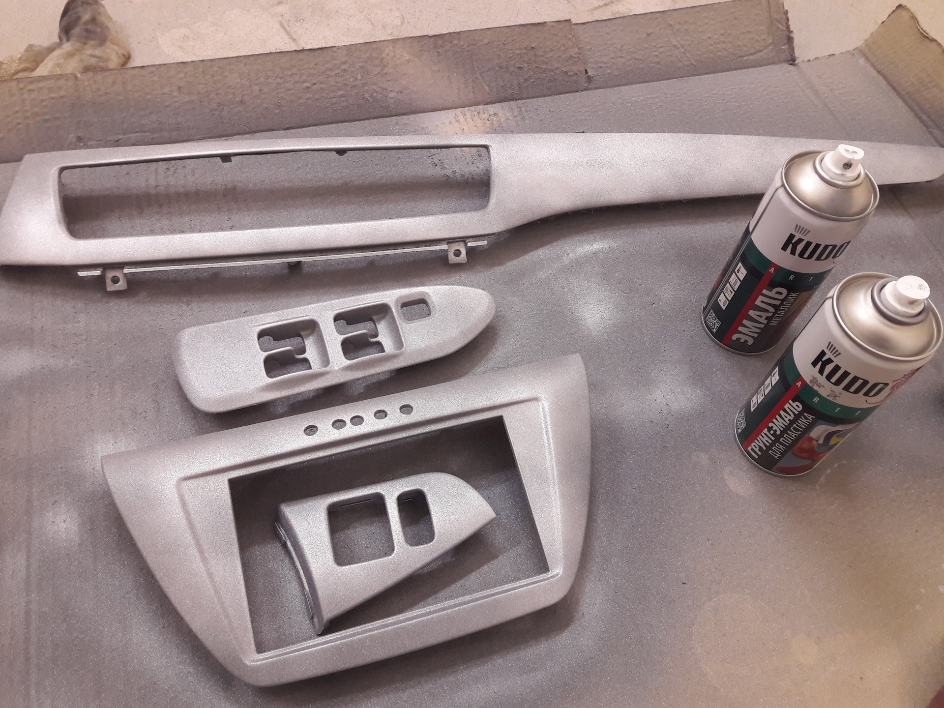Обезжирил (вместе с заводской краской обезжириватель снял слой пластмассы, загрунтлвал, взбрызнул серебристым металиком и залил лаком…
