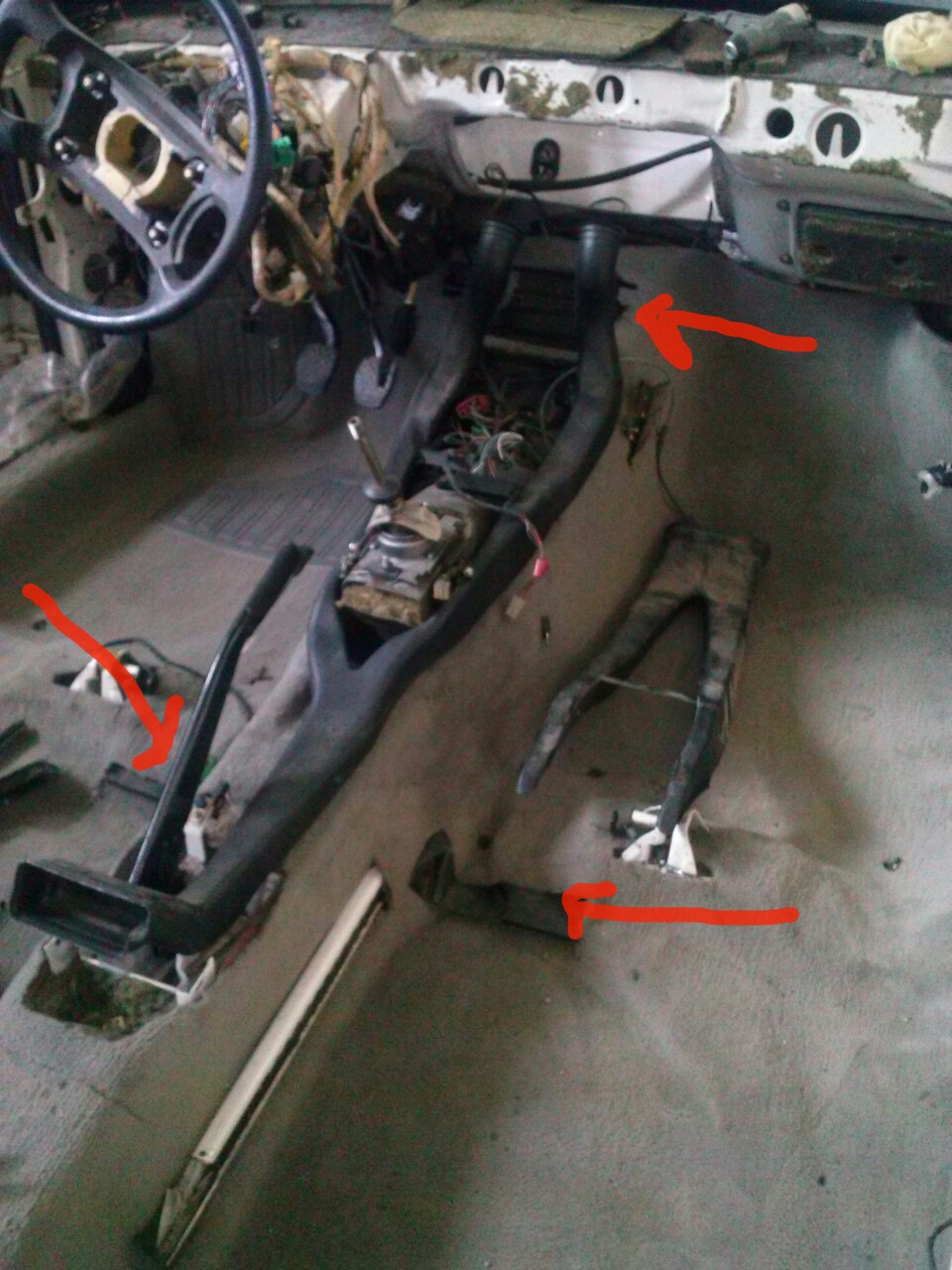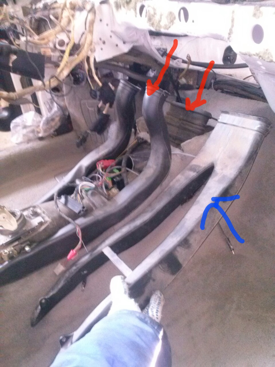 Вот на фото красными стрелками обозначены два воздуховода, один для ног(он под ковром, чтобы его установить надо поднимать ковер, в ковре даже с обратной стороны есть надрезы для выходов), и воздуховод для дефлектора тоннеля. Эти воздуховоды устанавливались заводом парой.