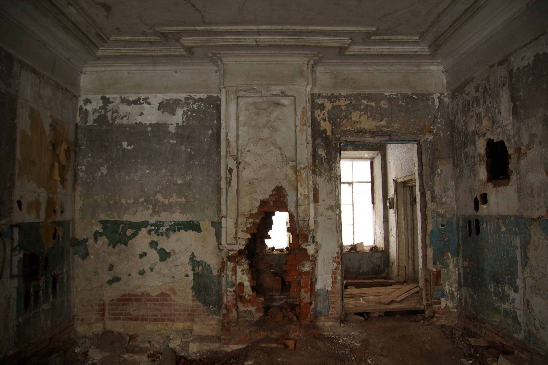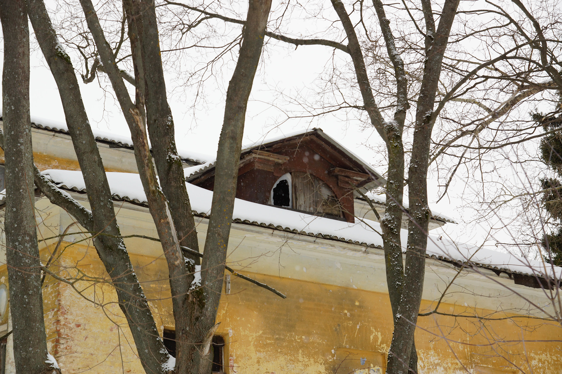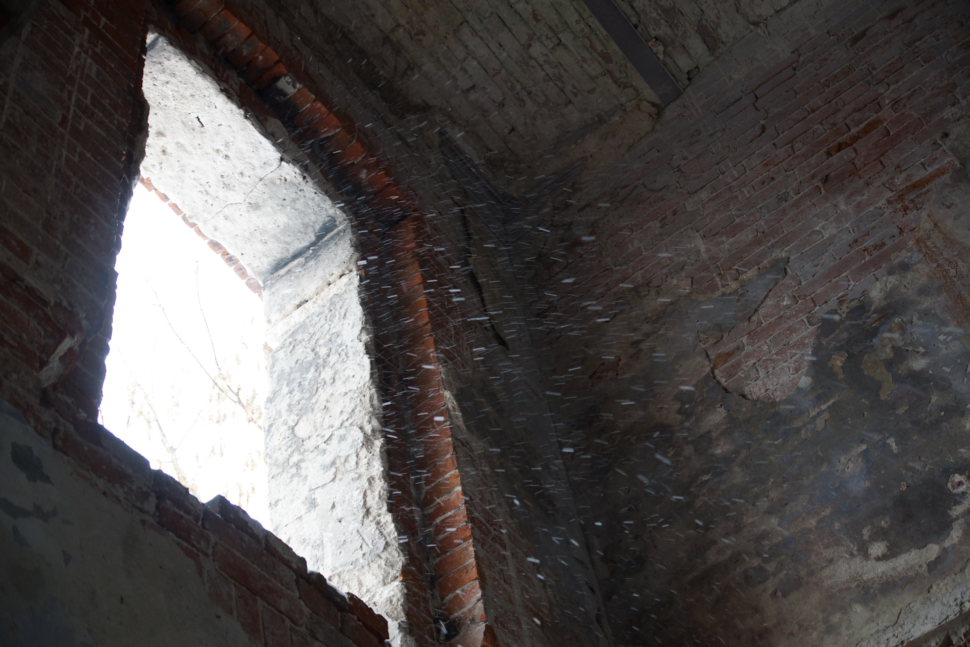 Зашёл во флигель. Стало тихо-тихо. Слышно, как снег опускается сквозь зияющие дыры окон на пол.