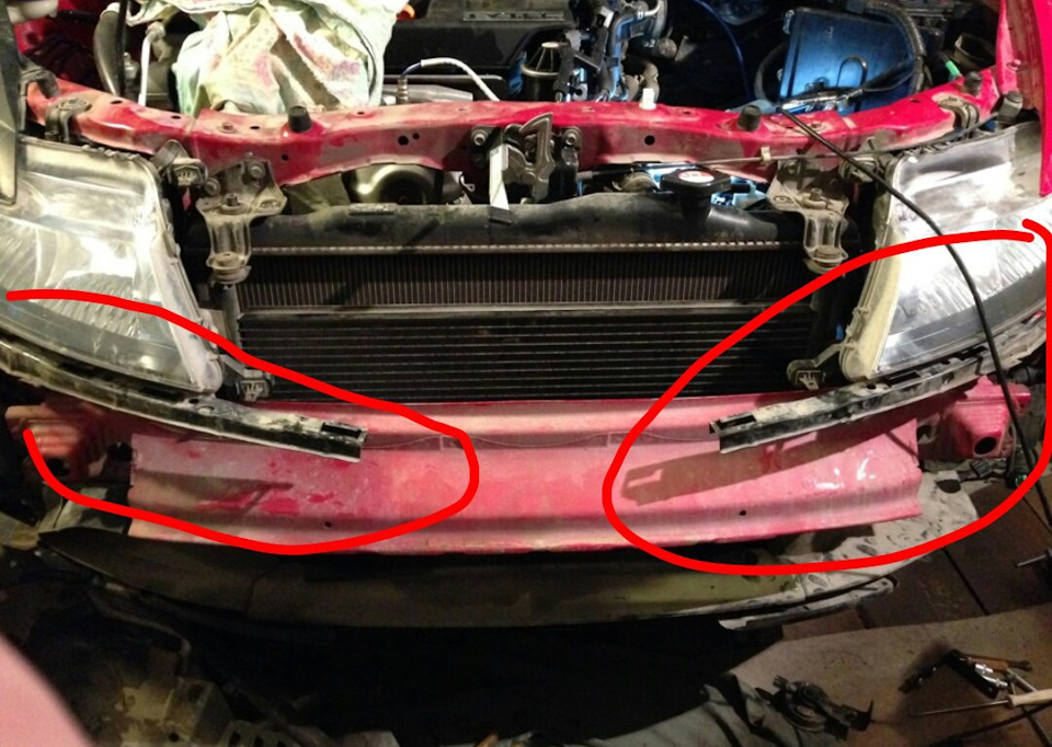 Так же отламываются и крепления фар. Все крепления проверить без разбора нельзя, но хотя бы, что бы, были целыми верхние и что бы фары не болтались.